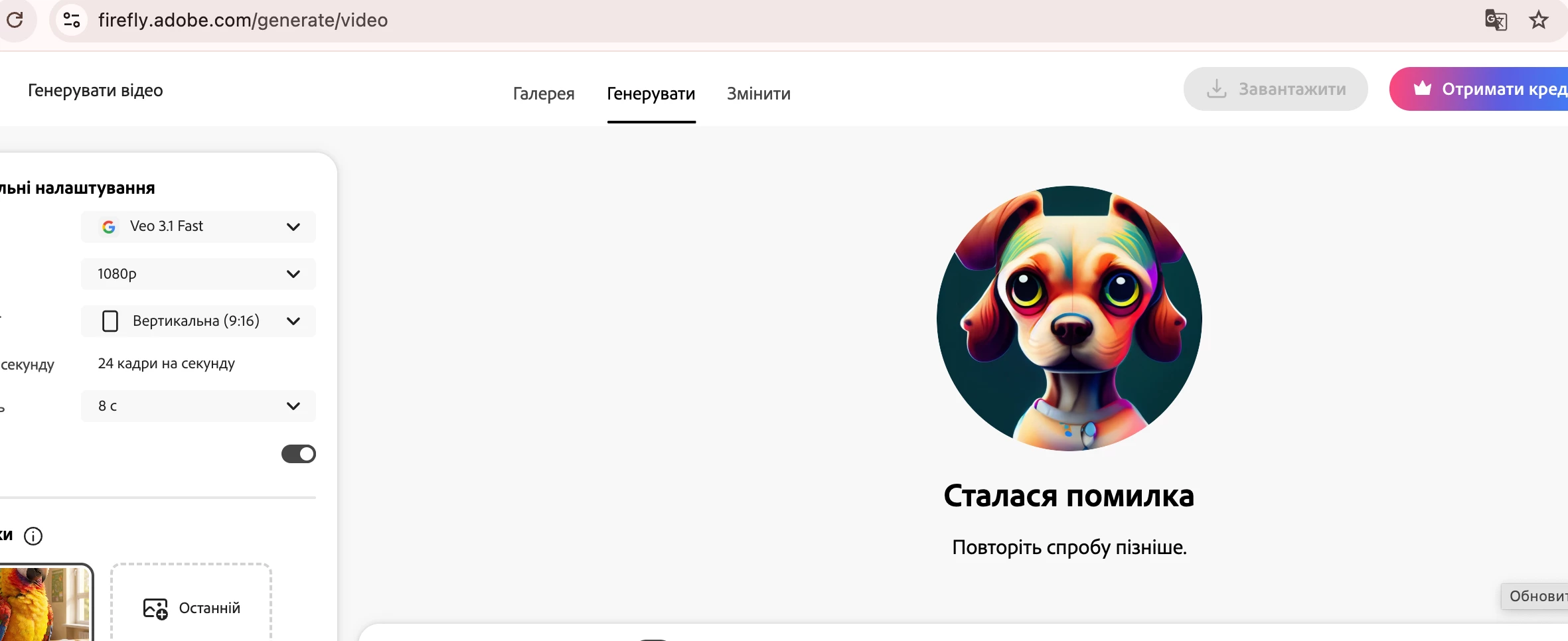 модель створення відео Veo 3.1 Fast вже понад 2 години вдає помилку при спробі згенерувати відео, пише : сталася помилка, повторіть спробу пізніше. Що робити?