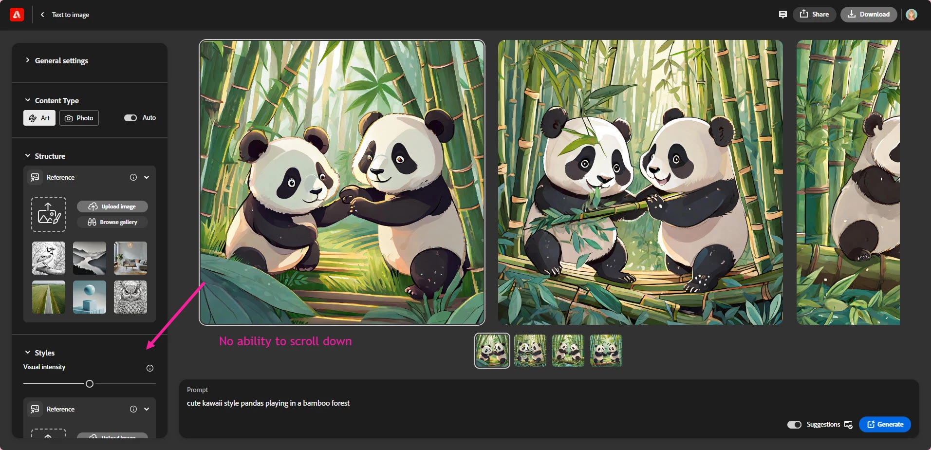 In Firefly, the options (widescreen, styles, etc.) are now on the left. I cannot scroll down to see all the options. This is Windows 11 using Edge.