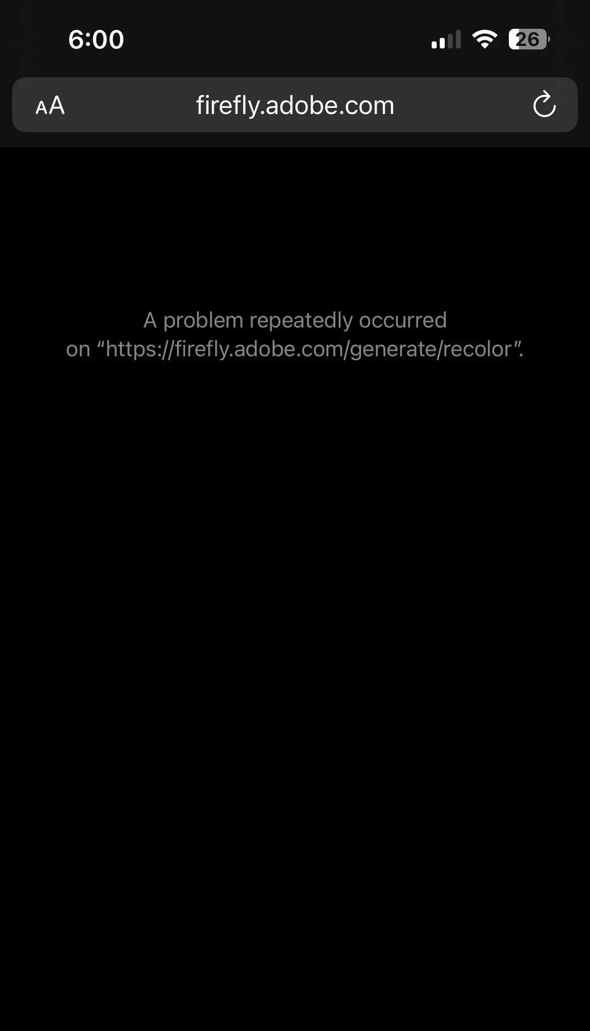 On Safari on iOS, the generative recolor on the Firefly mobile site will crash if you load a larger SVG (over 1.5mb) to recolor. As soon as you describe your palette, it reloads and crashes.