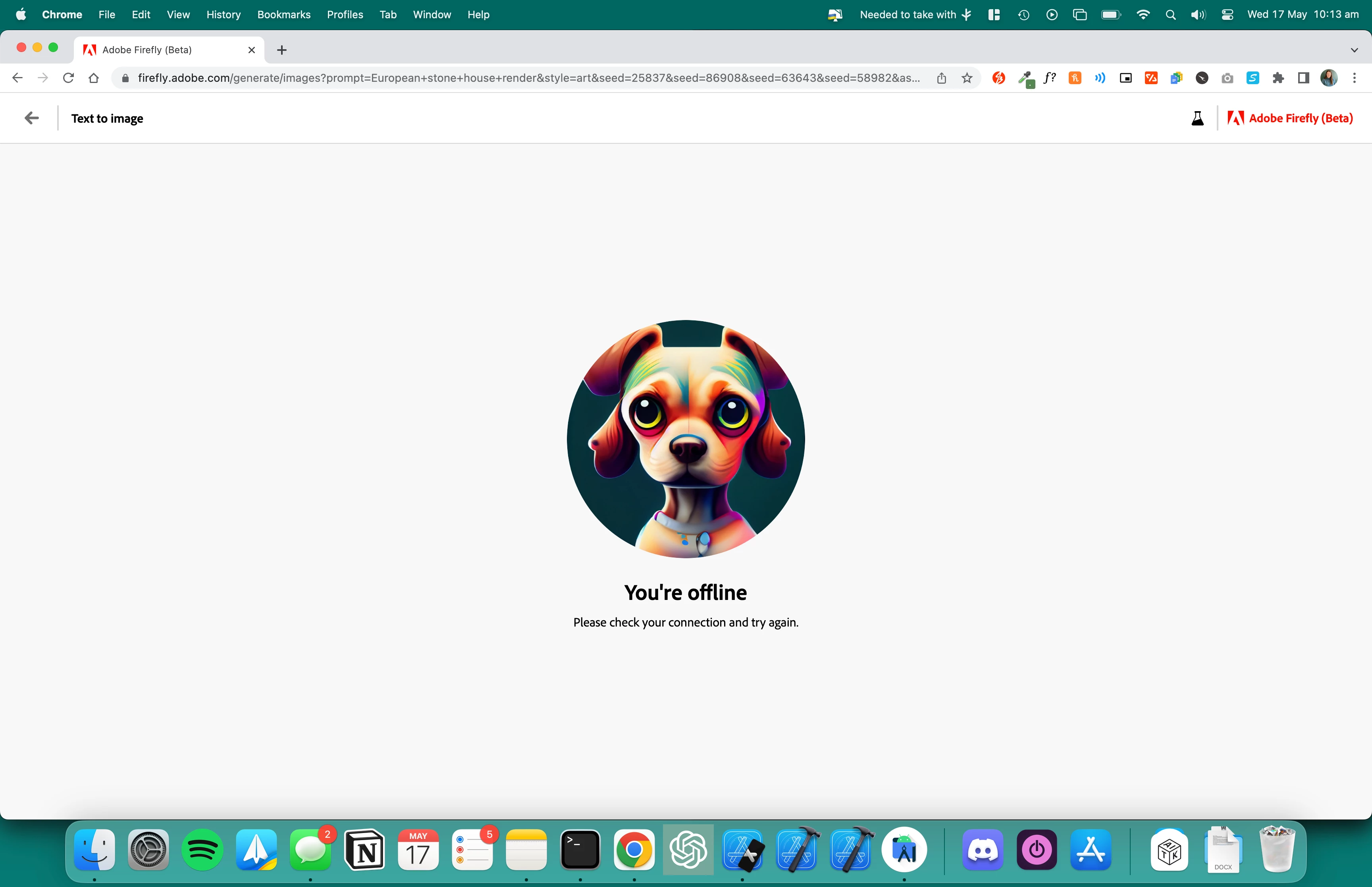 Attempting to use Adobe Firefly for the first time and entering a prompt then either hitting enter or clicking the "Generate" button takes me to a "You're Offline" page. Happy to provide more info on request.