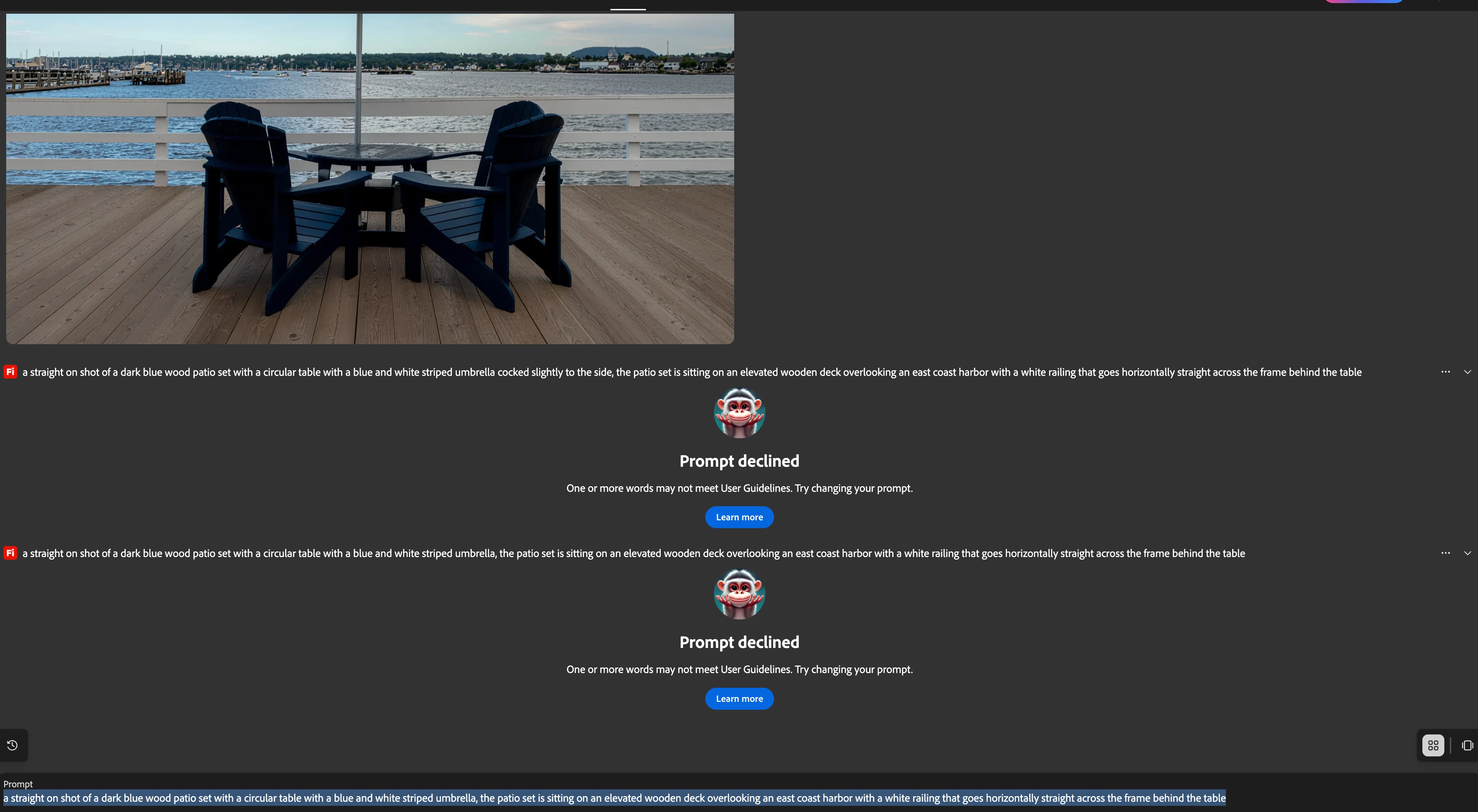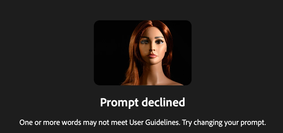 As a customer I expect the apps I use to function properly. Firefly is giving me the following error message: Prompt declined. I am using my own image and I’m not doing anything different that I have been doing previously. I and other customers would expect to be compensated, we cannot use a feature or function we are paying for.