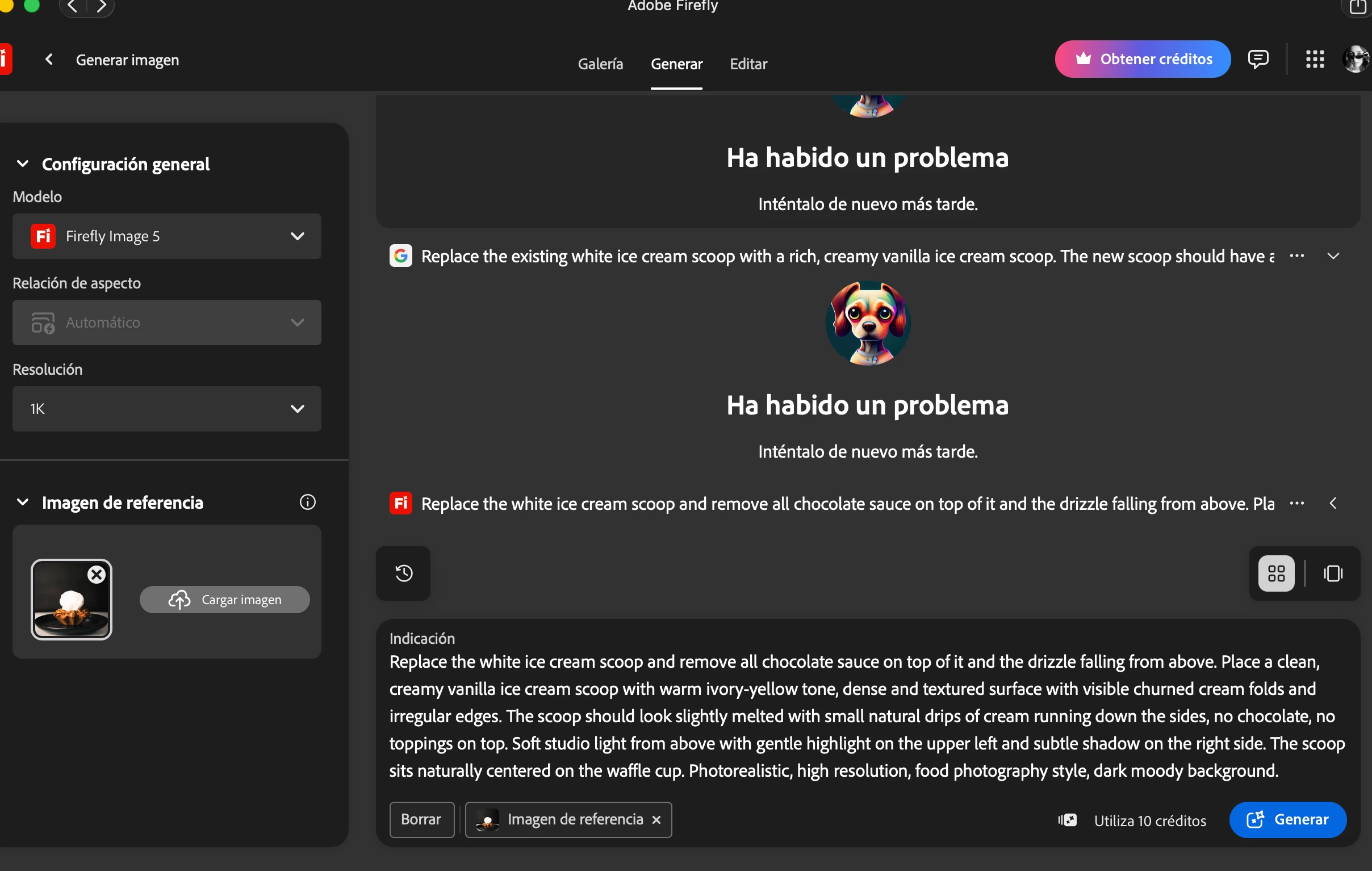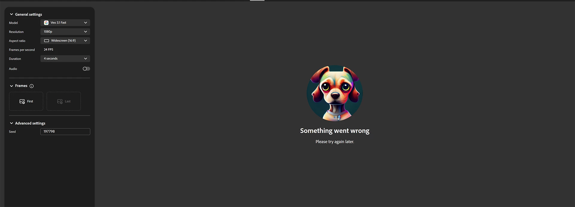 Can you please clarify, you mention that the Gemini model is failing but your second image shows you using the Firefly model. Are both failing for you.  Note that there have been problems with both in the past day. You can see status reports of service outages on status.adobe.com.