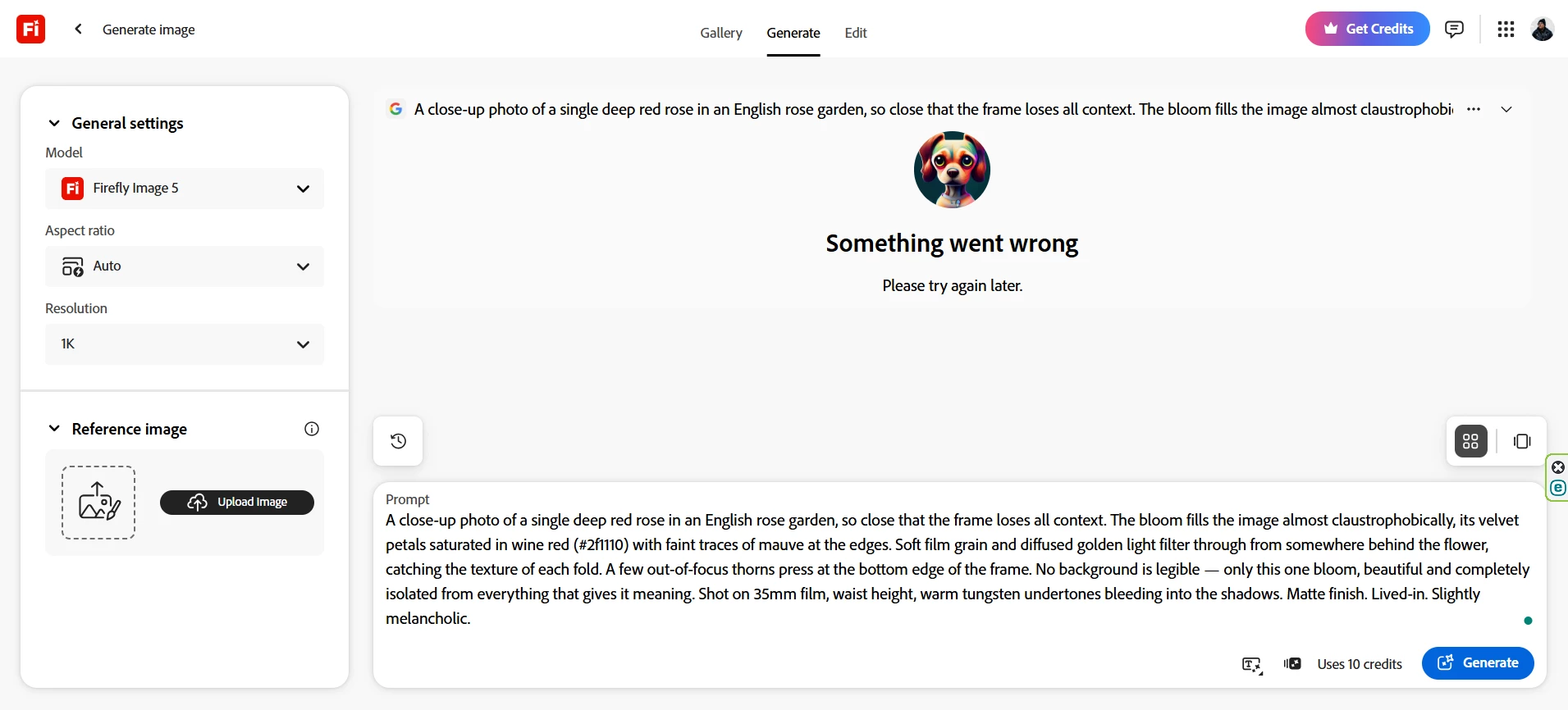 Firefly hasn't been able to load credits or generate images using Gemini 2.5. This issue started 3/25/26. I cleard my cache, and still no dice.