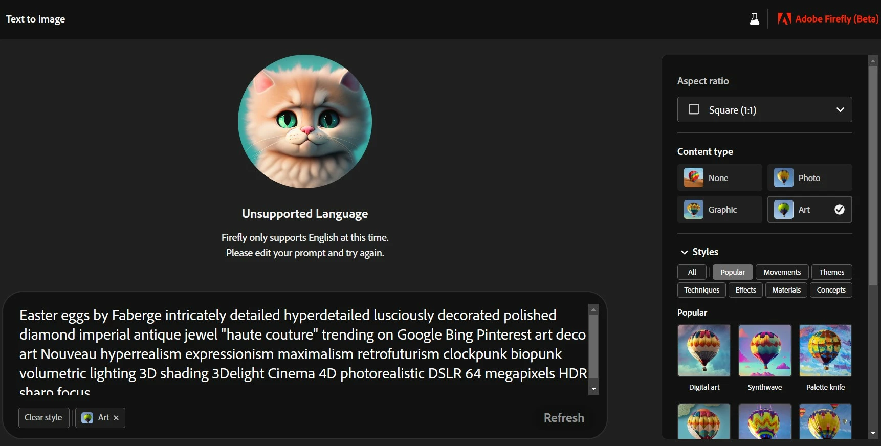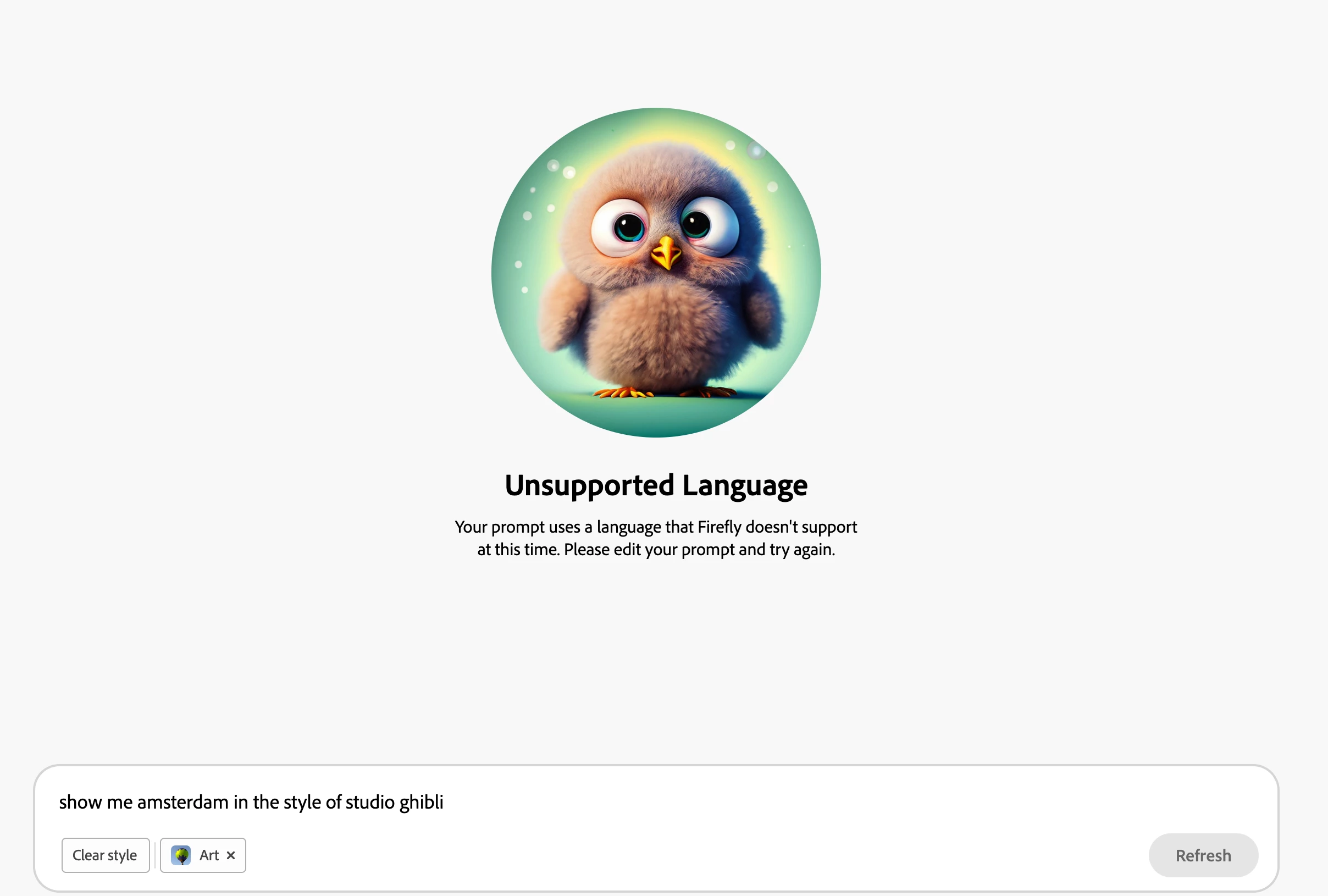 I am trying to generate an image in front of the Chinese Mann theatre in Hollywood, and I am receiving a notification that Firefly only supports English... however I'm not using a different language, I'm only using the word "Chinese" - this feels very overblocking to me, as this prevents me from referencing any type of Chinese art styles, Chinese locations, or Chinese people or cultures, which feels... wrong. Removing the word Chinese allows the prompt to work normally.