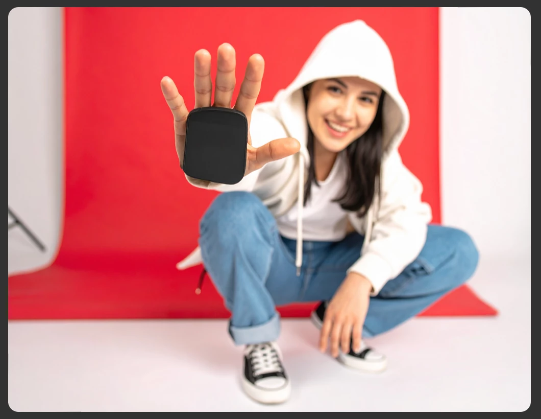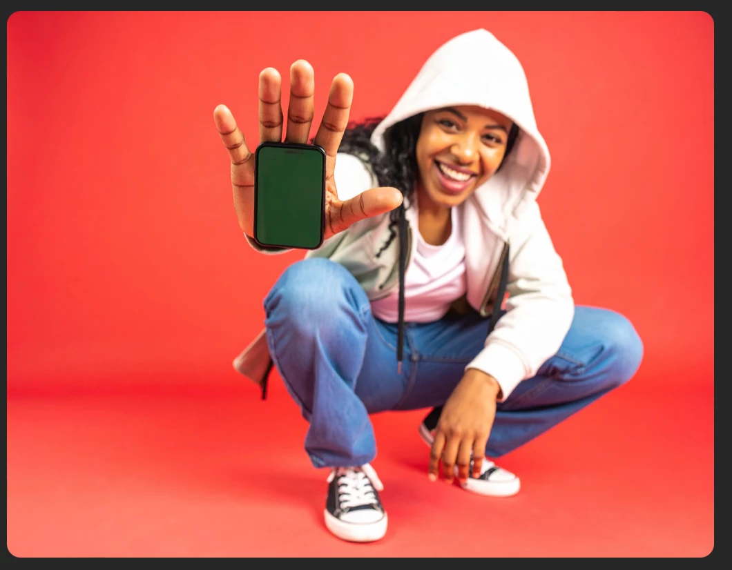 Portrait of a happy animated young woman in casual streetwear (hoodie and jeans/shorts) in a dynamic crouched pose, reaching one hand forward toward the camera in sharp focus, shallow depth of field with blurred background. One hand extended with fingers gripping a mobile phone in a landscape orientation. Professional studio lighting on white background, commercial photography style, bokeh effect, hand in foreground crisp and detailed while model's body softly blurred in background on a white background.
