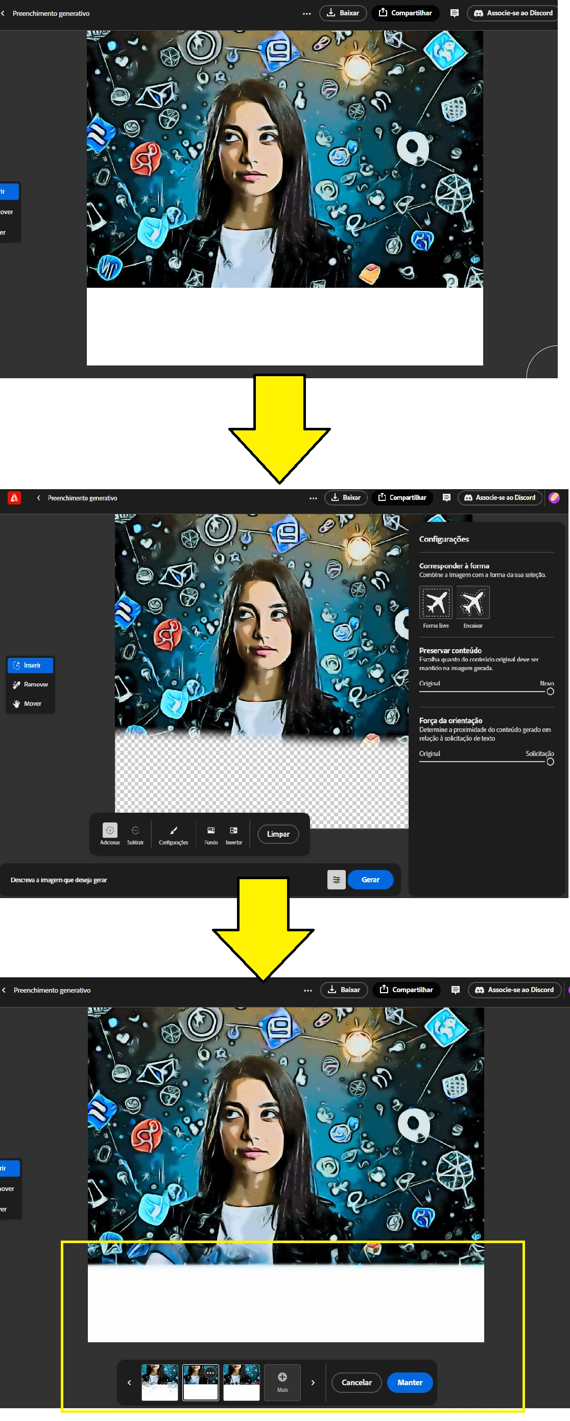 O preenchimento generativo, mesmo que configurado "Preservar conteúdo > totalmente novo" e "Força da orientação > totalmente novo" está preservando cerca de 90% da imagem original. Ao "esticar" a imagem no computador e fazer o upload, esse "esticamento" é uma barra toda branca, que vou deixar transparente no firefly, para preenchimento. Antigamente, quando se clicava em "gerar" sem adicionar nenhum prompt, o firefly preenchia com perfeição todo esse espaço. Agora, ele mantém 90% de fundo branco e só adiciona uma transição entre a imagem a ser mantida e o fundo branco, que deveria desaparecer.