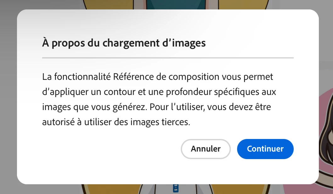Bonjour, j'ai un problème depuis quelques avec l'option structure. Quand je met une image de structure le logiciel ne la prend pas en compte. J'ai essayer de changer d'appareil, de moteur de recherche et version de firefly mais rien ne marche. Quand j'importe une image je reçois un message (en pièce jointe). J'ai vérifié mes crédit de génération et il m'en reste encore, même si je change la force de la structure ça ne change rien.
