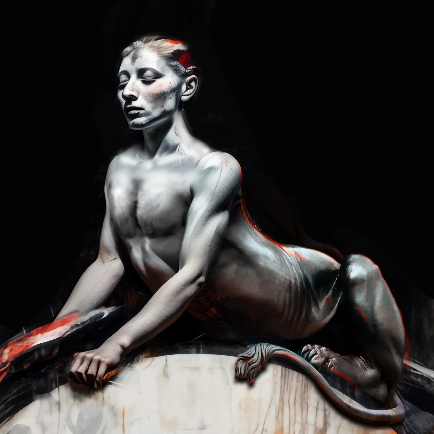 prompt: "3/4 view male sphinx doing the upward-facing dog yoga pose"