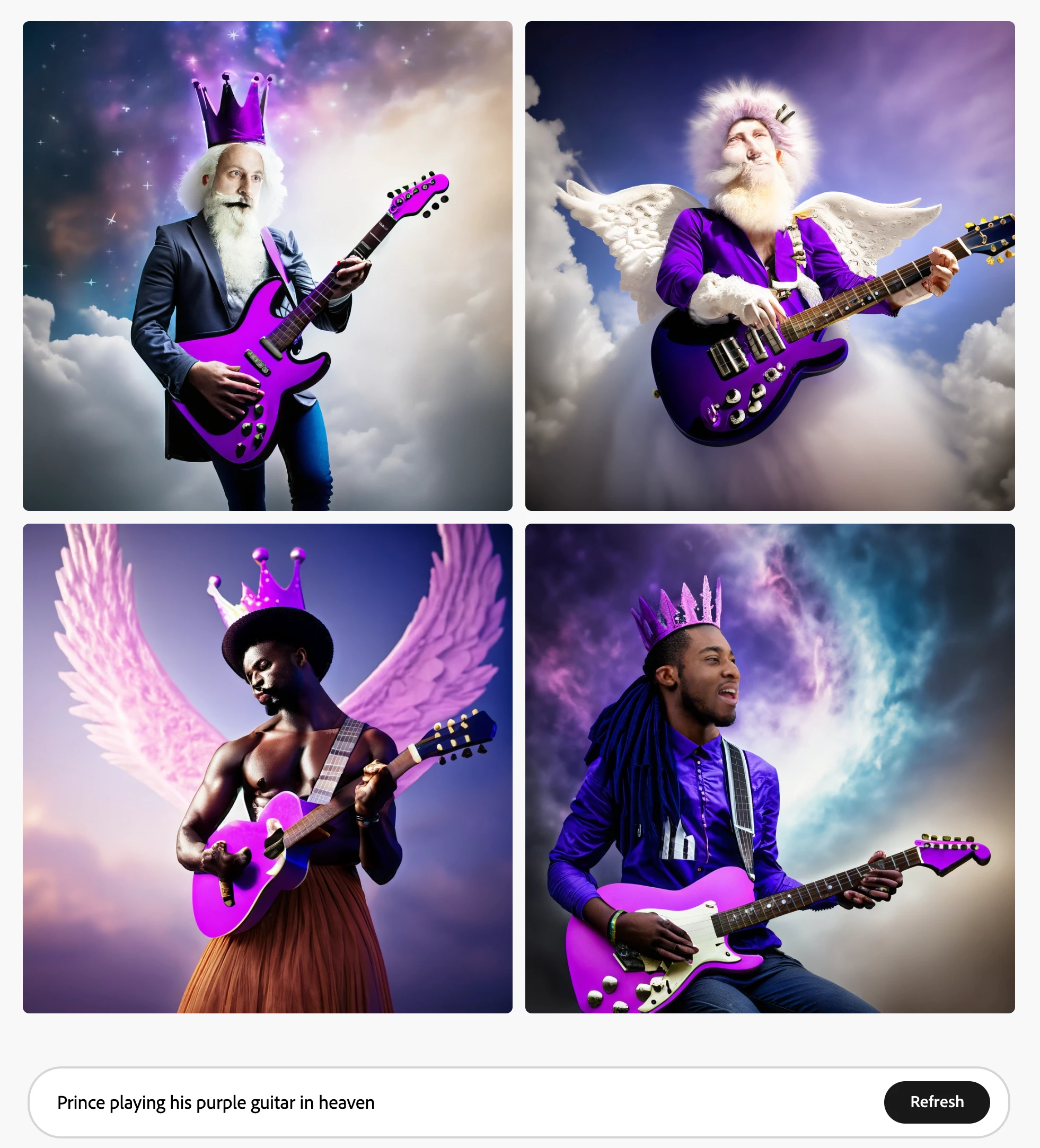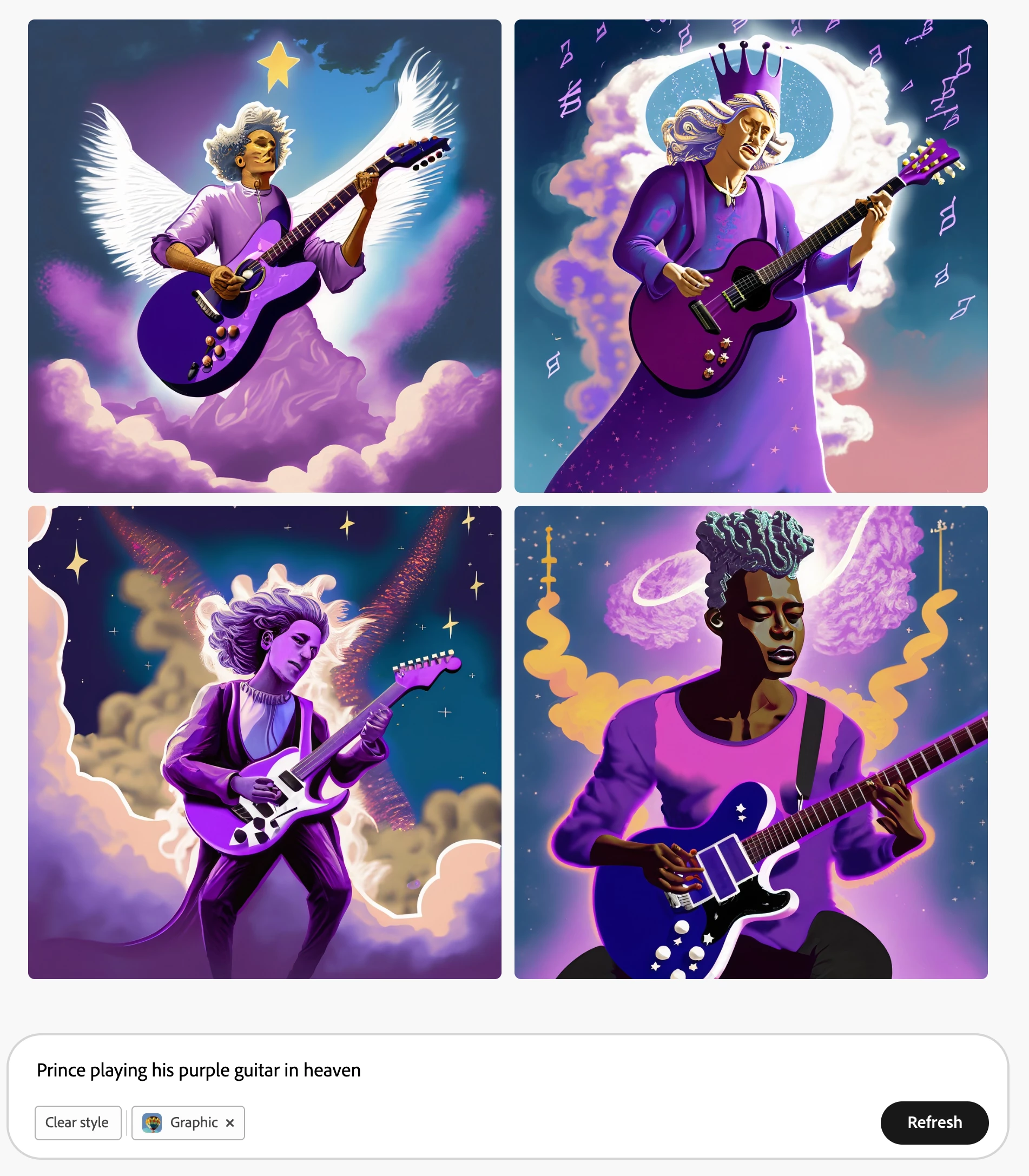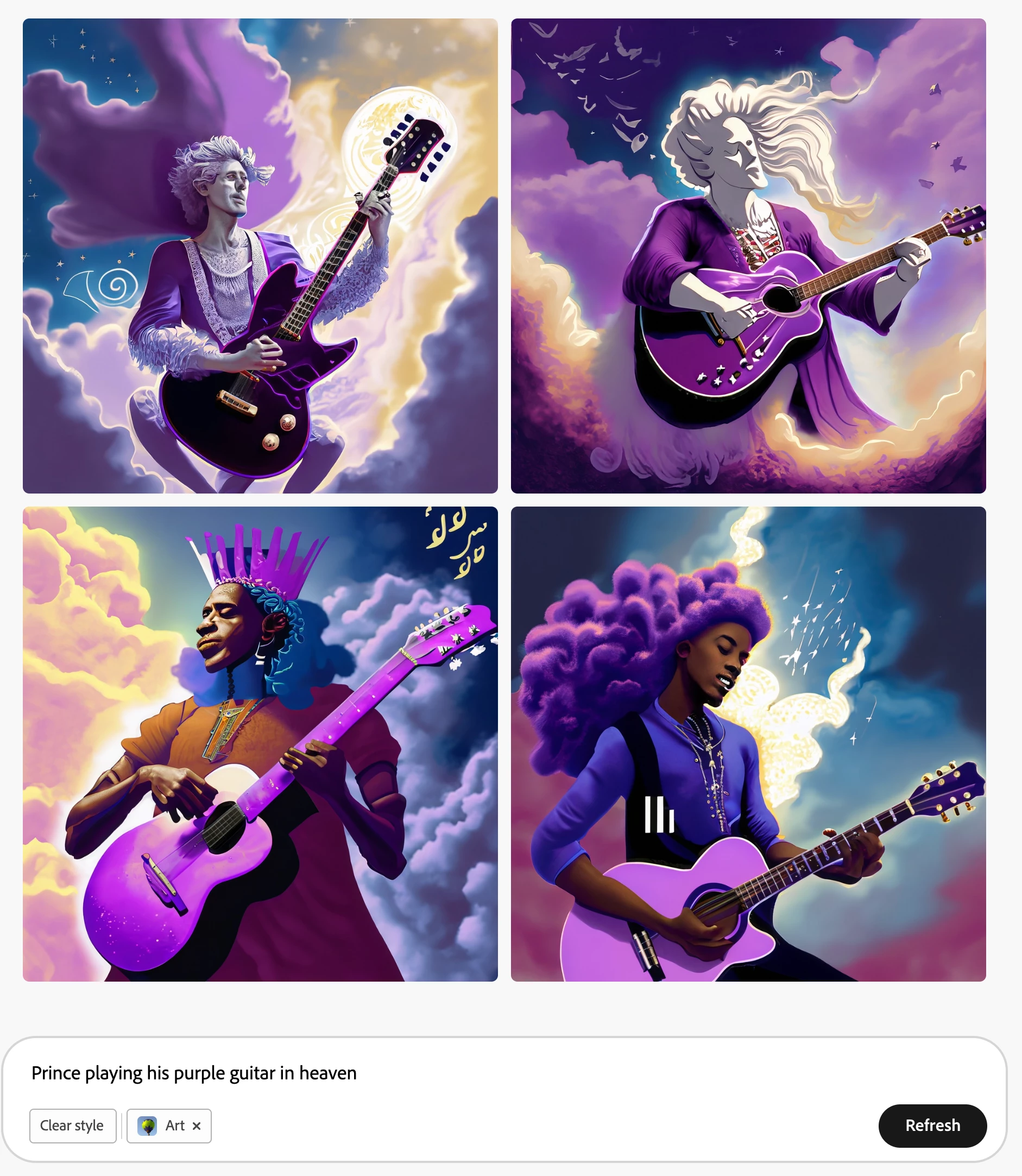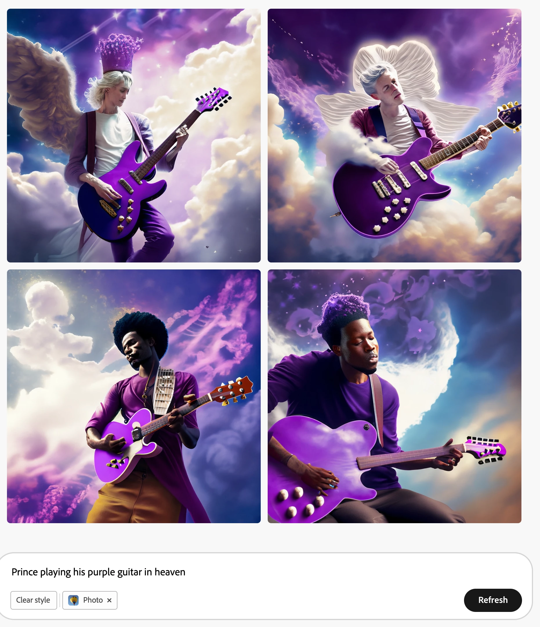 I tried render the musician Prince playing his purple guitar in a heaven setting. Firefly FAILED so horribly It didnt even try to search out the image of what Prince looked and gave horrible renditions in each Content type. See attachments below. Please improve this!!
