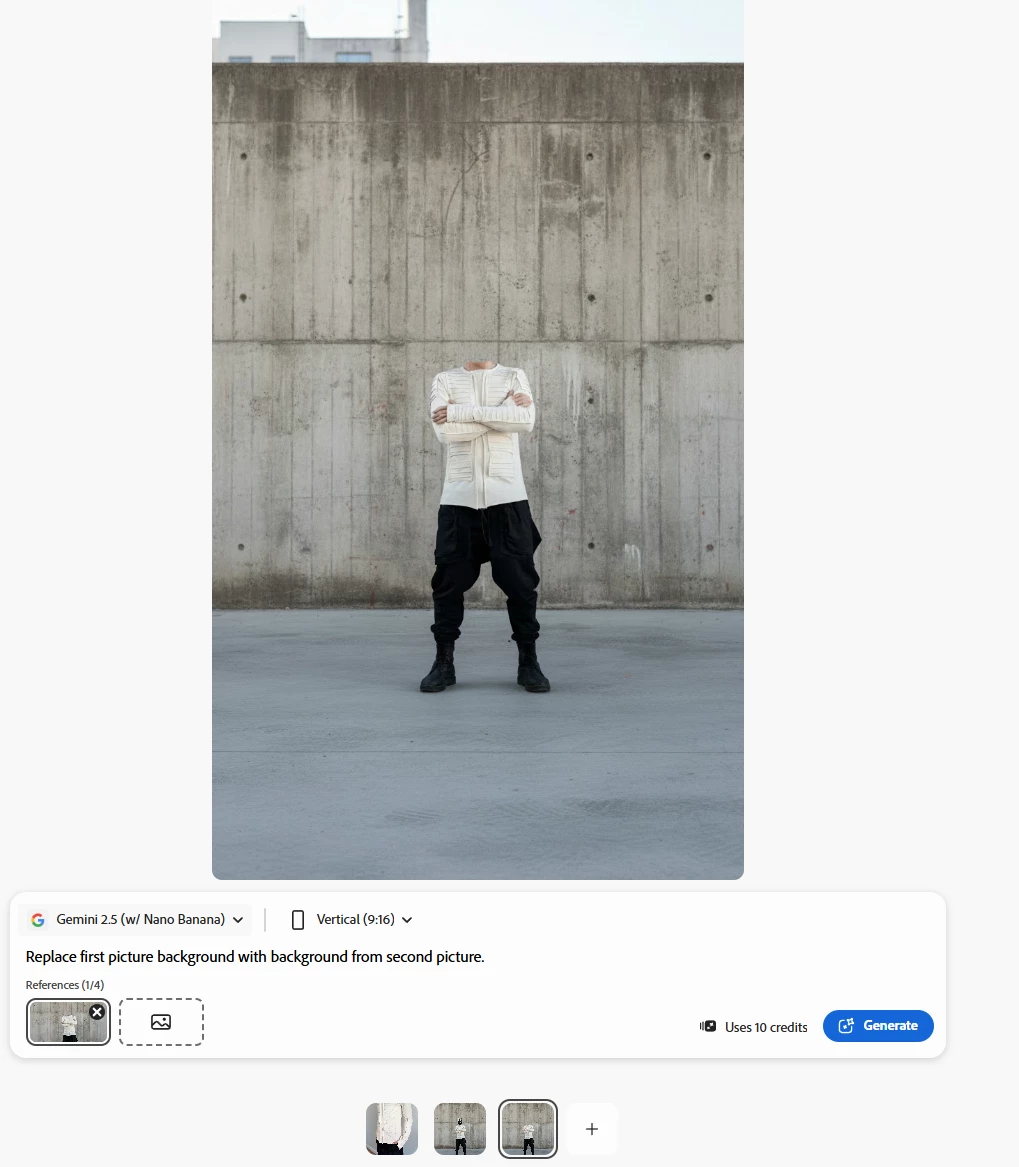 Sometimes 2 pictures reference doesn't work. Worked for me couple times: "Replace first picture background with background from second picture.", but then started to do wild things - like cutting head on 2nd image.