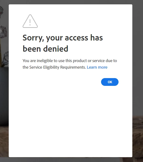 I'm getting this error when I log in: Sorry, your access has been denied. You are ineligible to use this product or service due to the Service Eligibility Requirements.