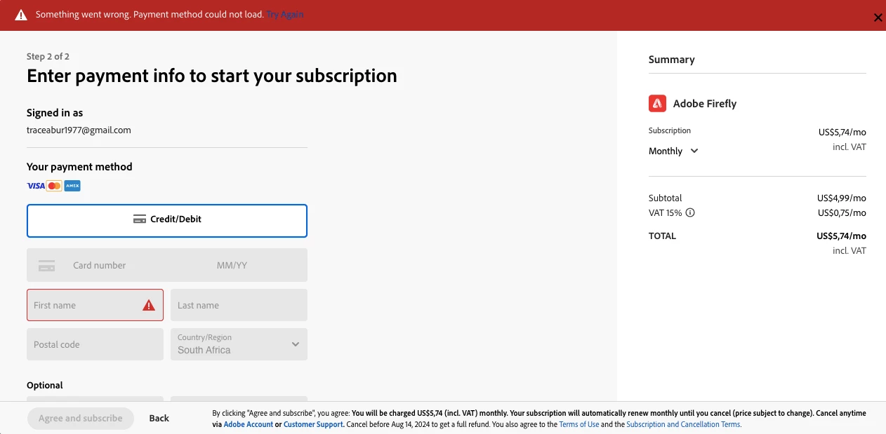 OOutThereGlobalParticipantForum|Forum|1 year agoJuly 31, 2024SubscriptionForum|Forum|1 year agoJuly 31, 20244 replies469 viewsI am unable to add credit or debit card details on your subscription firefly page. the credit details section is greyed out. Imaging