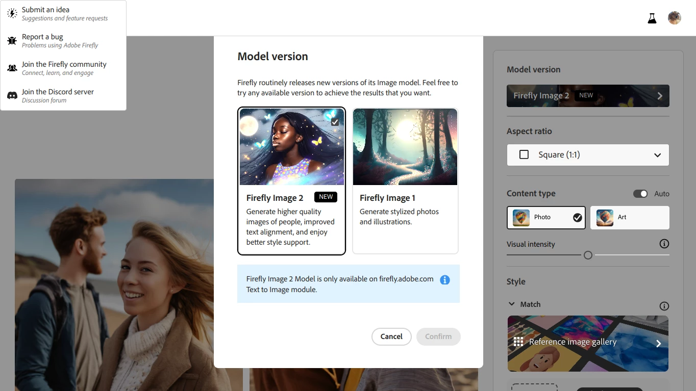 I was using Adobe Firefly today when I noticed a weird thing. When I add in a text prompt to use 'text to image' function, as soon as I click generate, it pops up with an overlay covering a massive portion of the screen and its asking me which model version I want to use. When I choose one, and click confirm, nothing else happens. Same with option 2. And there is no X button, sadly. I know what you're thinking.... yes, I have tried the 'cancel' option. It doesn't do anything.