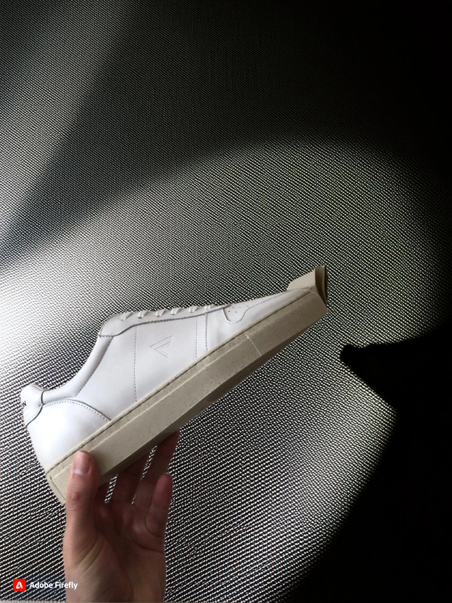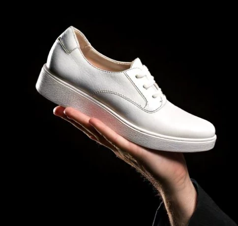 hand holding a white shoe on black background