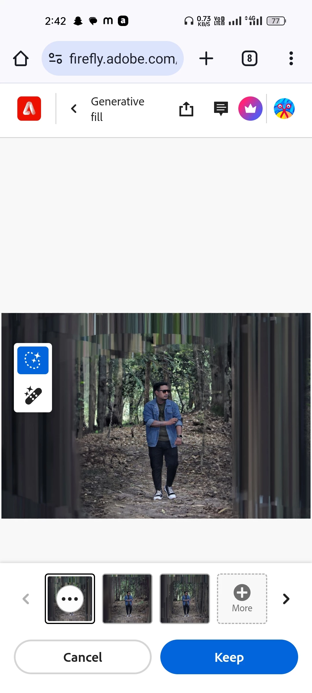 I used generative fill to change the background and when the result came, the entire background turned out to be glitch type. Adobe Firefly is not working well in my mobile, this is happening with everyone for many days, you can see my screenshots. I used generative fill for the forest background and it turned out to be some glitch type. Please fix it.🙏