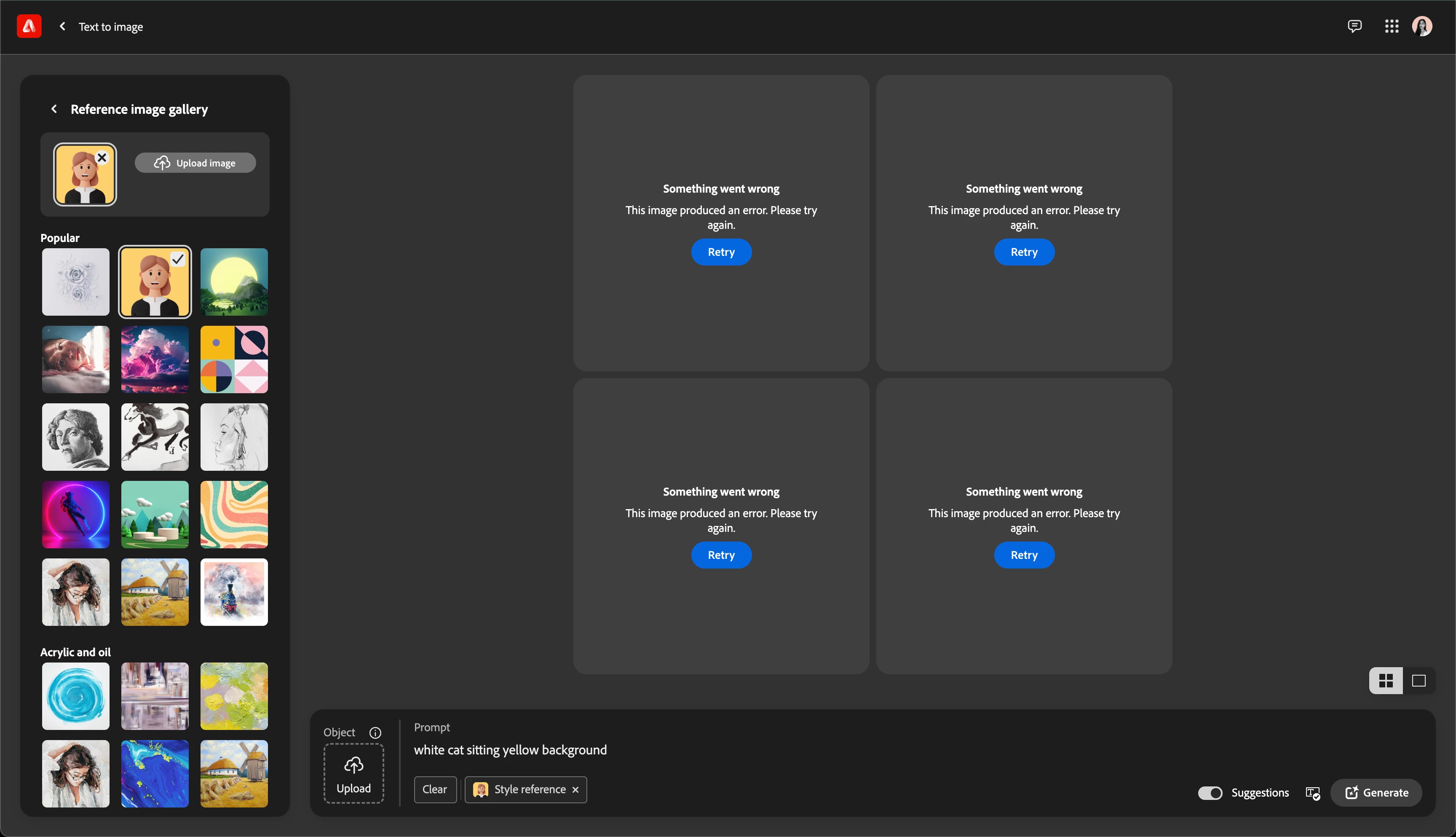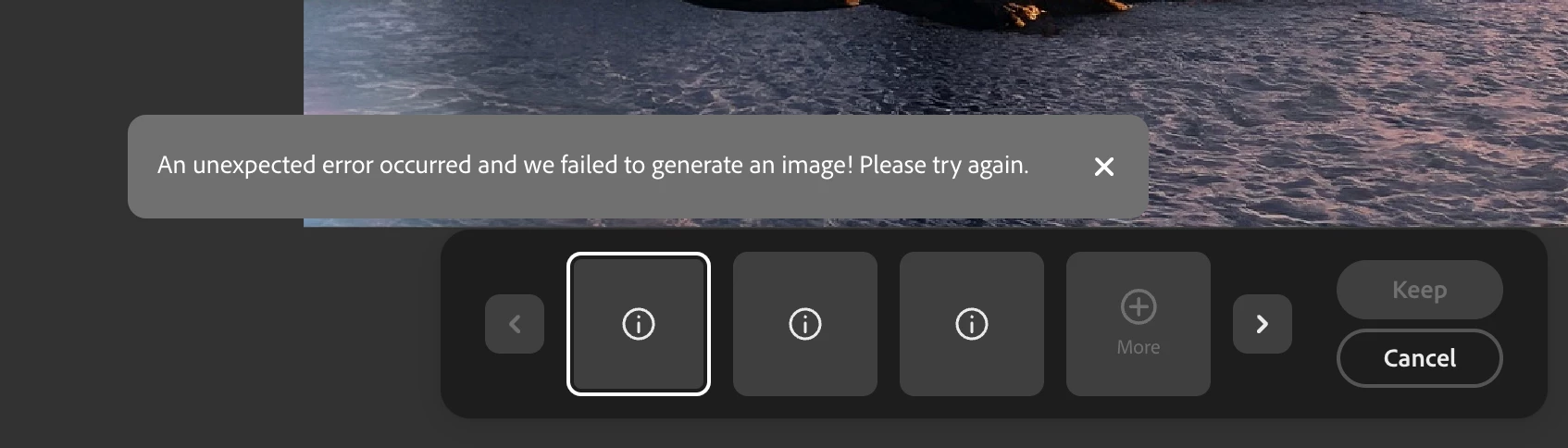 I am unable to use generative AI fill, it generates via basic prompts provided, however when I try changing or adding another reference or object fill it shows "unexpected error occured try again". Pls help or suggest how to fix this!