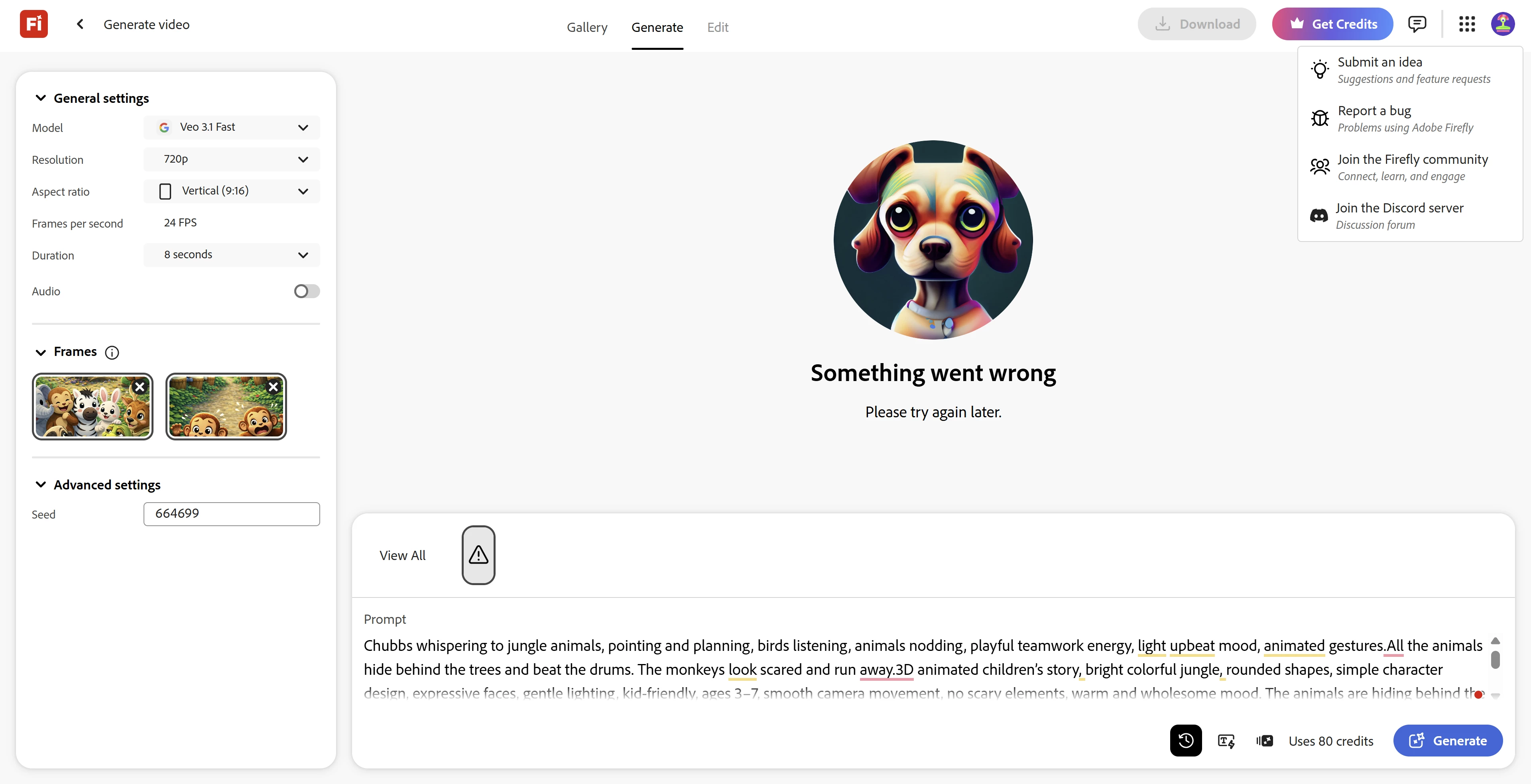 Unable to generate videos for past two days. Same error message keeps popping up.