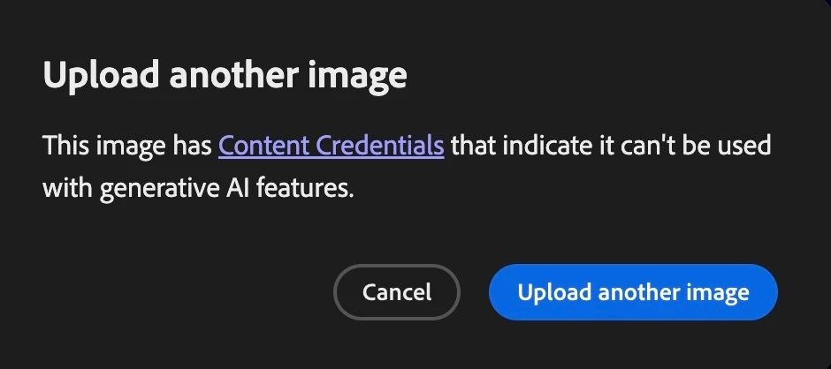 uploading reference images for video are failing and showing Content Credentials. Regardless of the imager I upload.