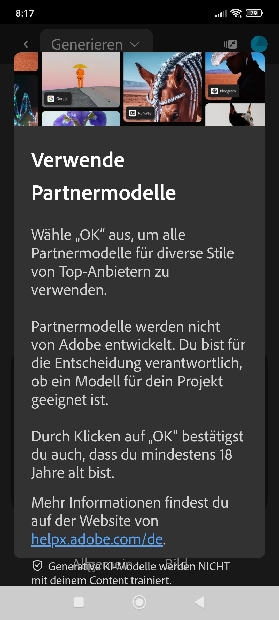 Hallo, ich kann keine Bilder generieren. Immer kommt dieses bild.aber es gibt auch nirgends die Option auf OK zu drücken. Habe das Standard Abo ganz neu. Kann mir da eventuell jemand helfen? Vielen Dank
