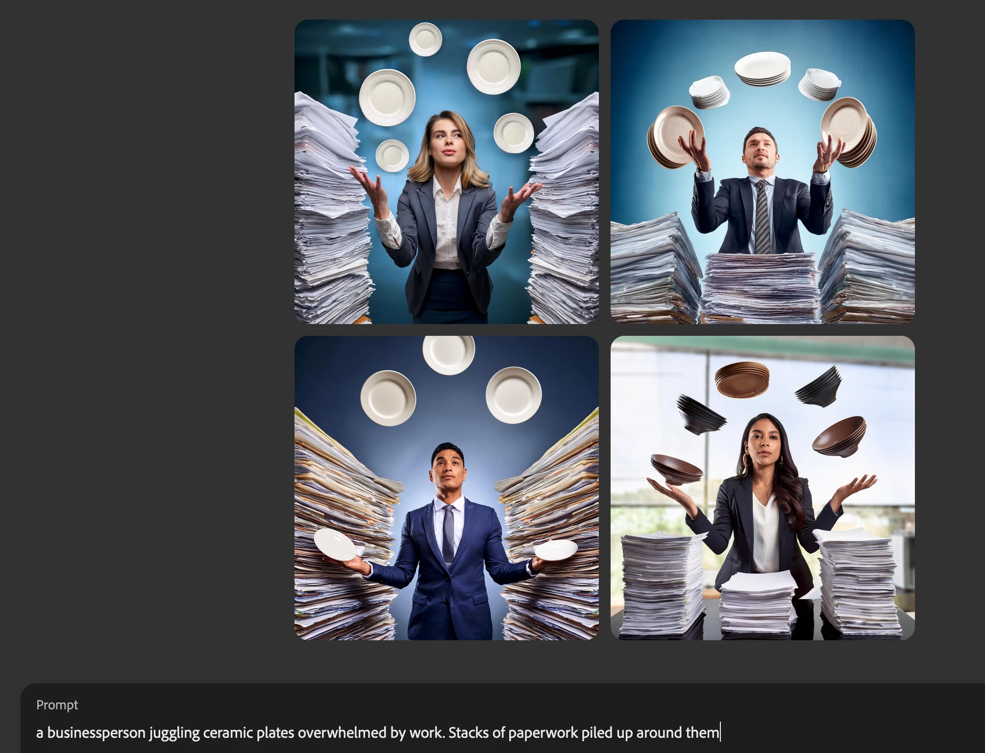 Weird Censorship: I provided the prompt "spinning plates inundated by work", and got a monkey telling me "Uh oh, One or more words may not meet User Guidelines and were removed." I edited the prompt to "use the idea of spinning plates to express the idea of being inundated by work", and the same problem. Needless to say, the suggested images were not at all what I wanted.