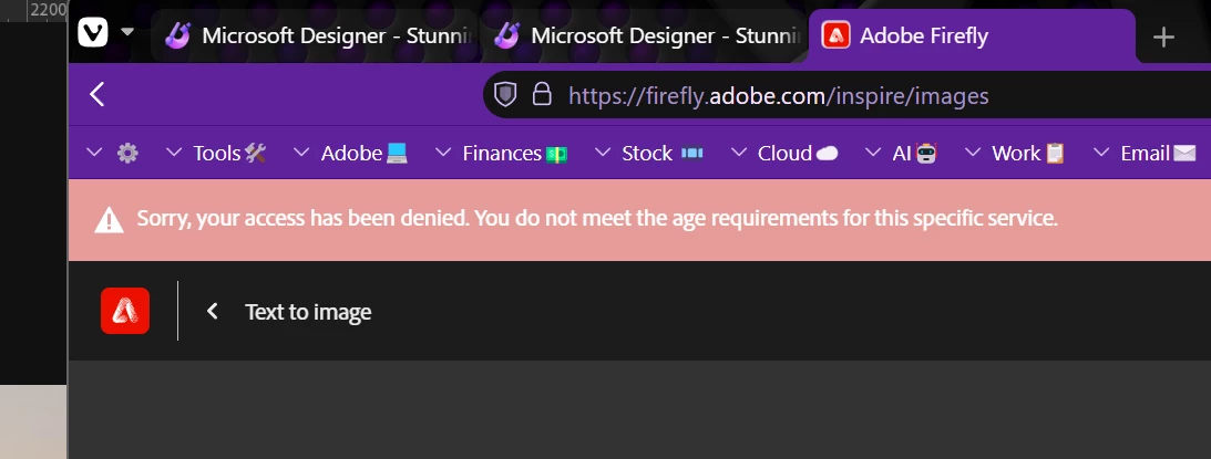 Firefly said that I'm not old enough to use it's full features. But I have an Adobe account that should have no problem verifying my age... and I'm 38-years-old lol.