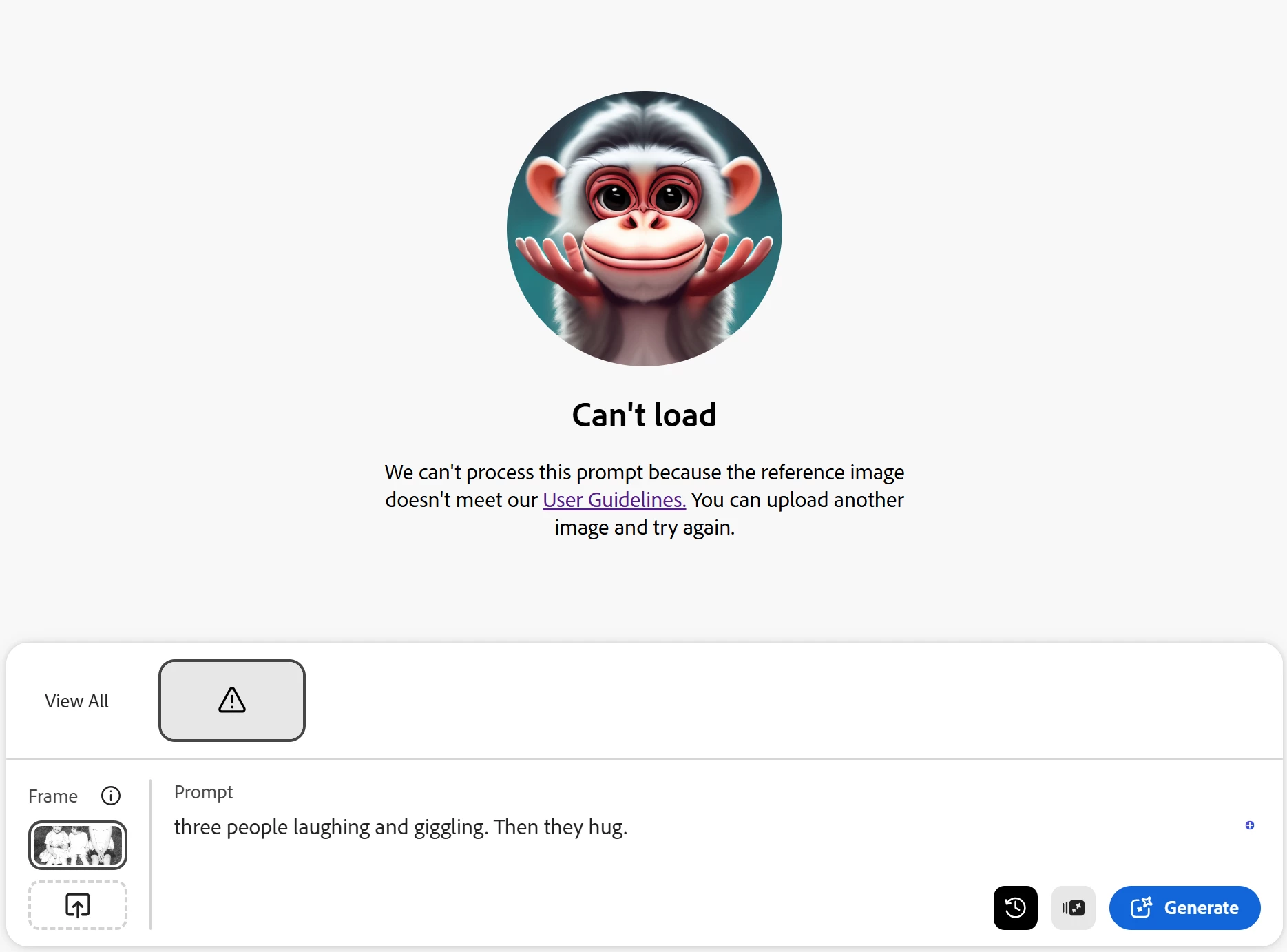 All I am trying to do is animate this photo of me and my sisters when we were kids. I see nothing in your guidelines against this. You need to add a button where we can challenge the bot's decision and get a human to evaluate the image and prompt, because this is ridiculous. What is wrong with "three people laughing and giggling. Then they hug."??? I originally tried the word "sisters" but changed it after it was blocked. Can you tell your bot there is nothing wrong with laughing, giggling, or hugging?