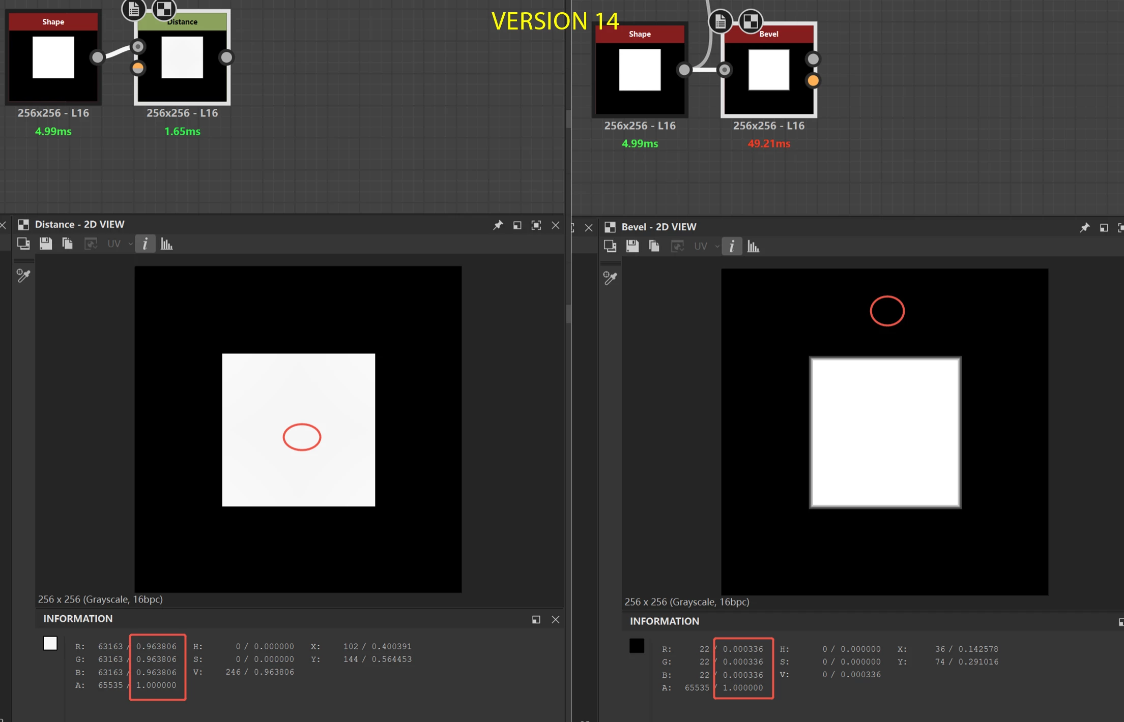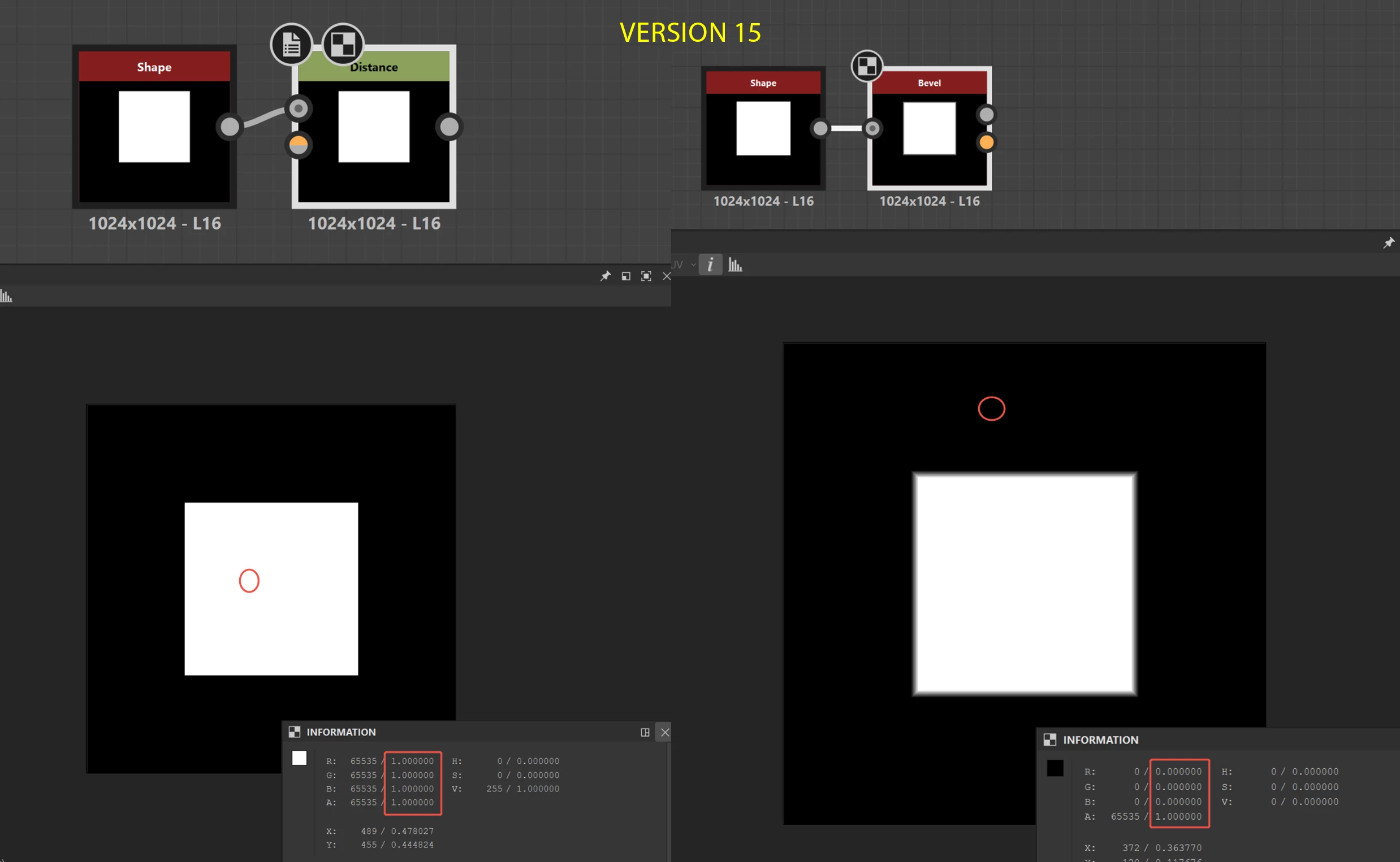 In version 15, textures generated using the distance node exhibit precision deviations in pure white and pure black sections, rendering subsequent comparison algorithms unusable.