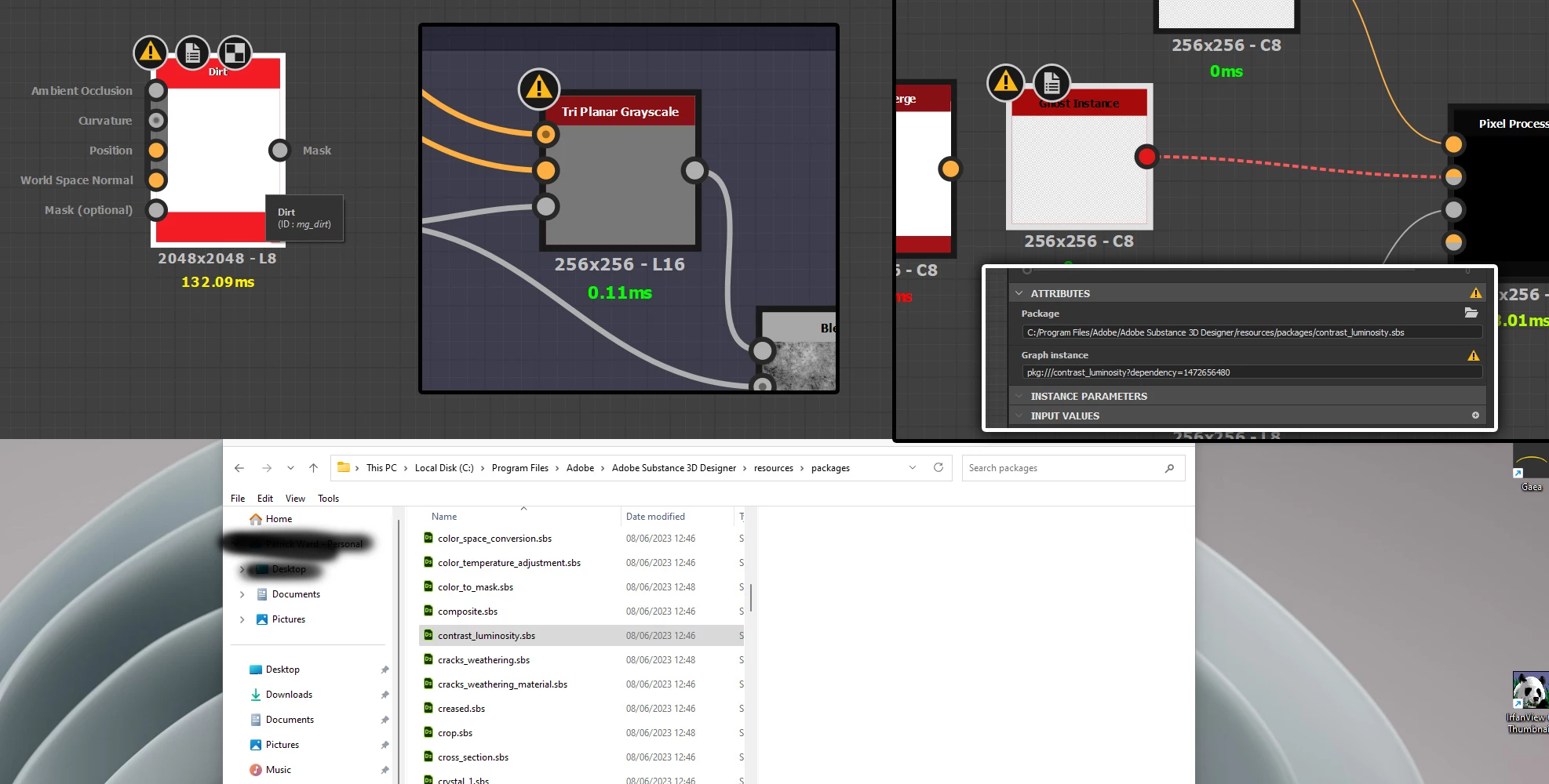 My Substance 3D Designer is fully up to date but when I come to use mg_dirt I get a warning that its got an error. That contrast_luminosity cannot be found, yet the address its pointing to ...