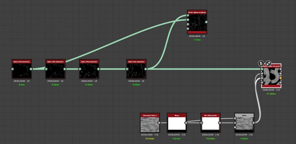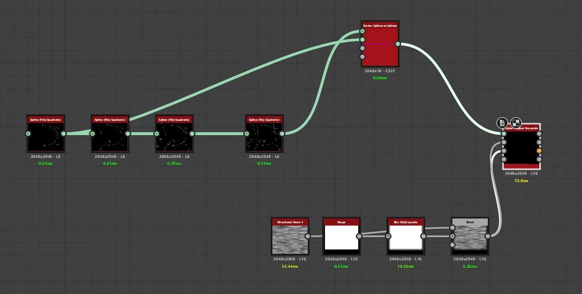 When using scatter spline on spline and trying to hook it up to a spline mapper grayscale afterwards, the spline mapper grayscale does not return any result and has no information in the UV output.