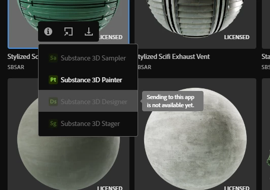 I want to make some changes to a material I got from the Substance 3d Assets Librarym, but I only have the option to import it to painter and not designer. It instead says that sending to this app is not available yet.