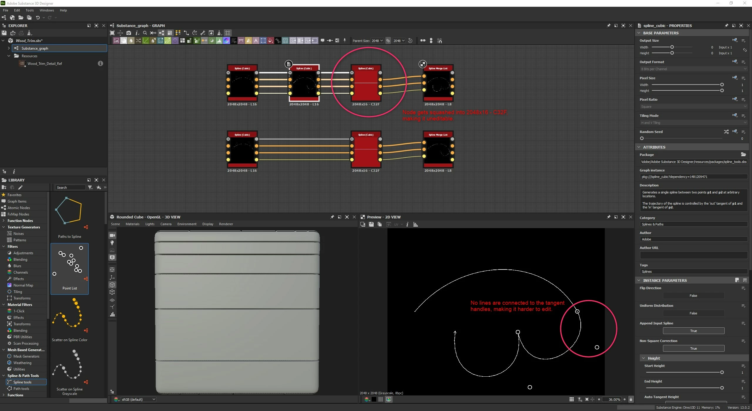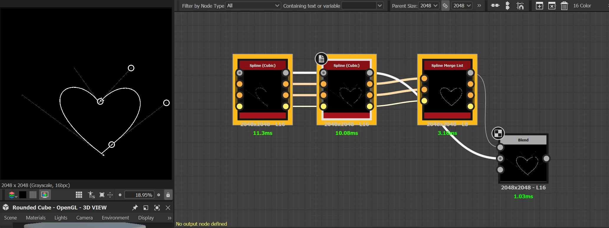 - The final result is as expected, albeit with two issues: 1. the tangent handle lines are no longer visible in the 2D preview when one of the spline nodes are selected and 2. The last Spline (Cubic) node gets squashed into 2048x16 C32F, making it uneditable. The effect always happens to the final Spline (Cubic) node in the chain, regardless of how many are connected.
