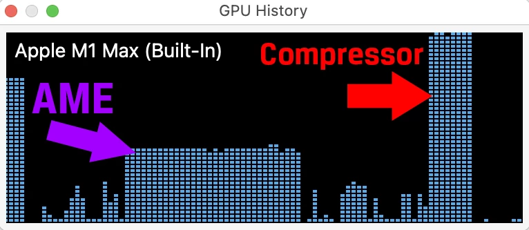 We recently got Macs with M1 Max inside, and I found that Apple Compressor exports ProRes 422 two to four times faster than AME can do with hardware acceleration enabled. My guess is AME only uses one of the two available Media Engines on the Max, possibly for both encode and decode. This also seems to only affect ProRes exports, as the H264/5 exports in AME are a bit faster than Compressor. I've attached a screenshot of the GPU history during both exports; you can see that AME appears to be utilizing about half while Compressor maxes out. AME exported at the same speed whether plugged in or on battery power.