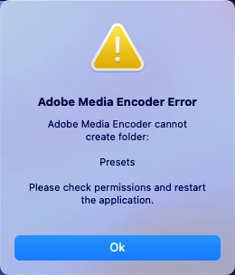 After updating Media Encoder I am unable to launch the App beyond the Error Message: "Adobe Media Encoder cannot create folder: Presets. Please check permissions and restart the application."