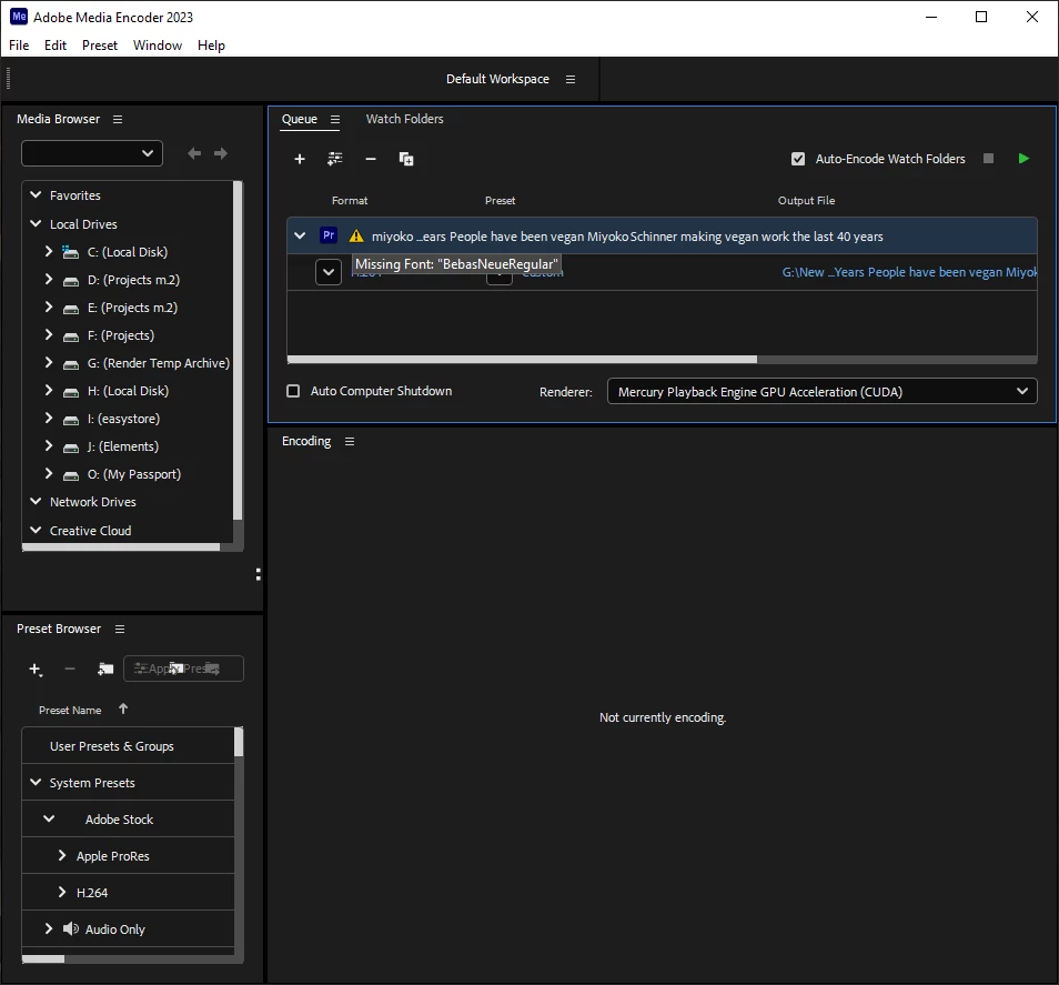 Adobe Media Encoder keeps showing Bebas font missing. Sometimes it doesn't cause a problem sometimes it does. And this is really disrupting my workflow and has been a problem for like a year. I've reported it before and Adobe said "it is a known problem" but that was like a f!#%#ing year ago.