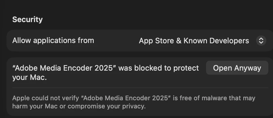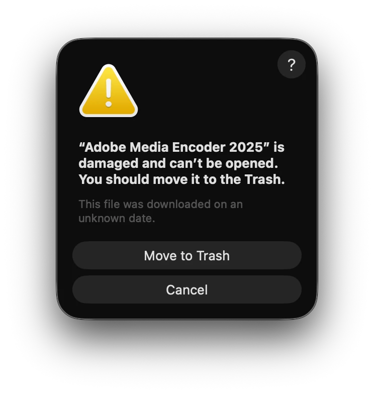 "Adobe Media Encoder 2025" is damaged and can't be opened. You should move it to the Trash."