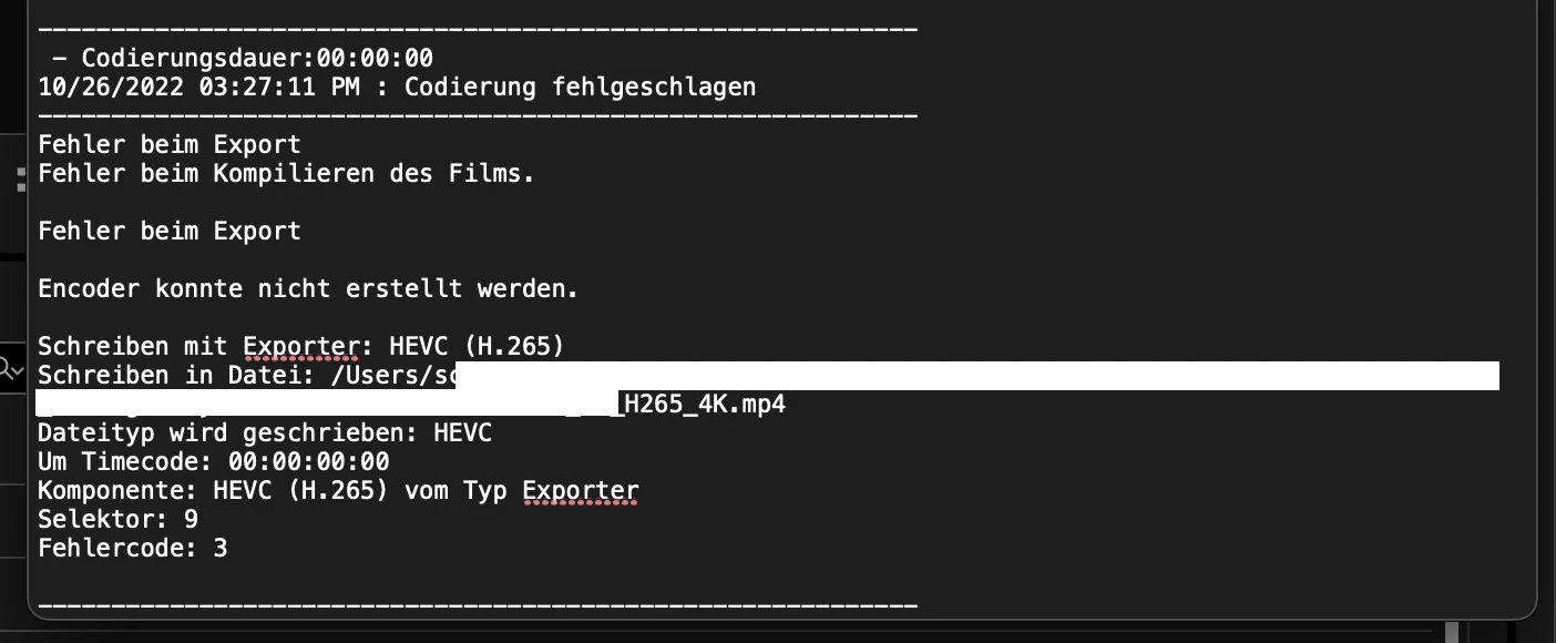 The Error log says "Error during export. Encoder could not be created." (translated from german)