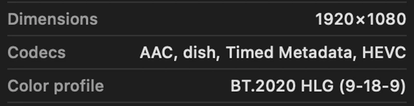 For the file in question, Finder reports the Codecs as AAC, dish, Timed Metadata, HEVC. Note the unusual appearance of “dish”. That is the only thing unusual about the video.
