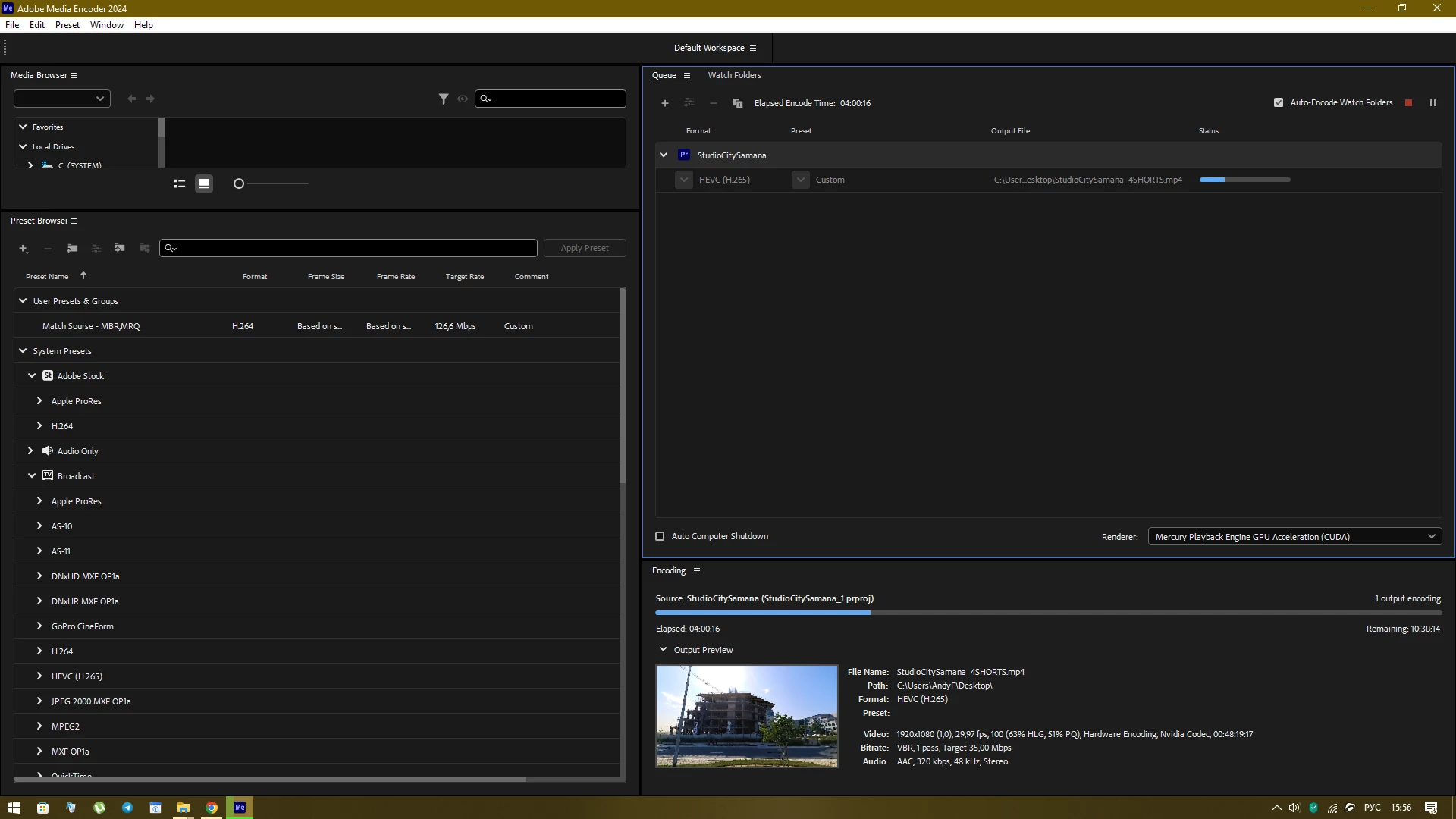I do not often use Me and I had no idea this software is so ridiculously slow. Now that I'm looking at the elapsed and estimated times this gives me the impression that Media Encoder does not ustilize CUDA or uses the e-cores of my Intel CPU alone.