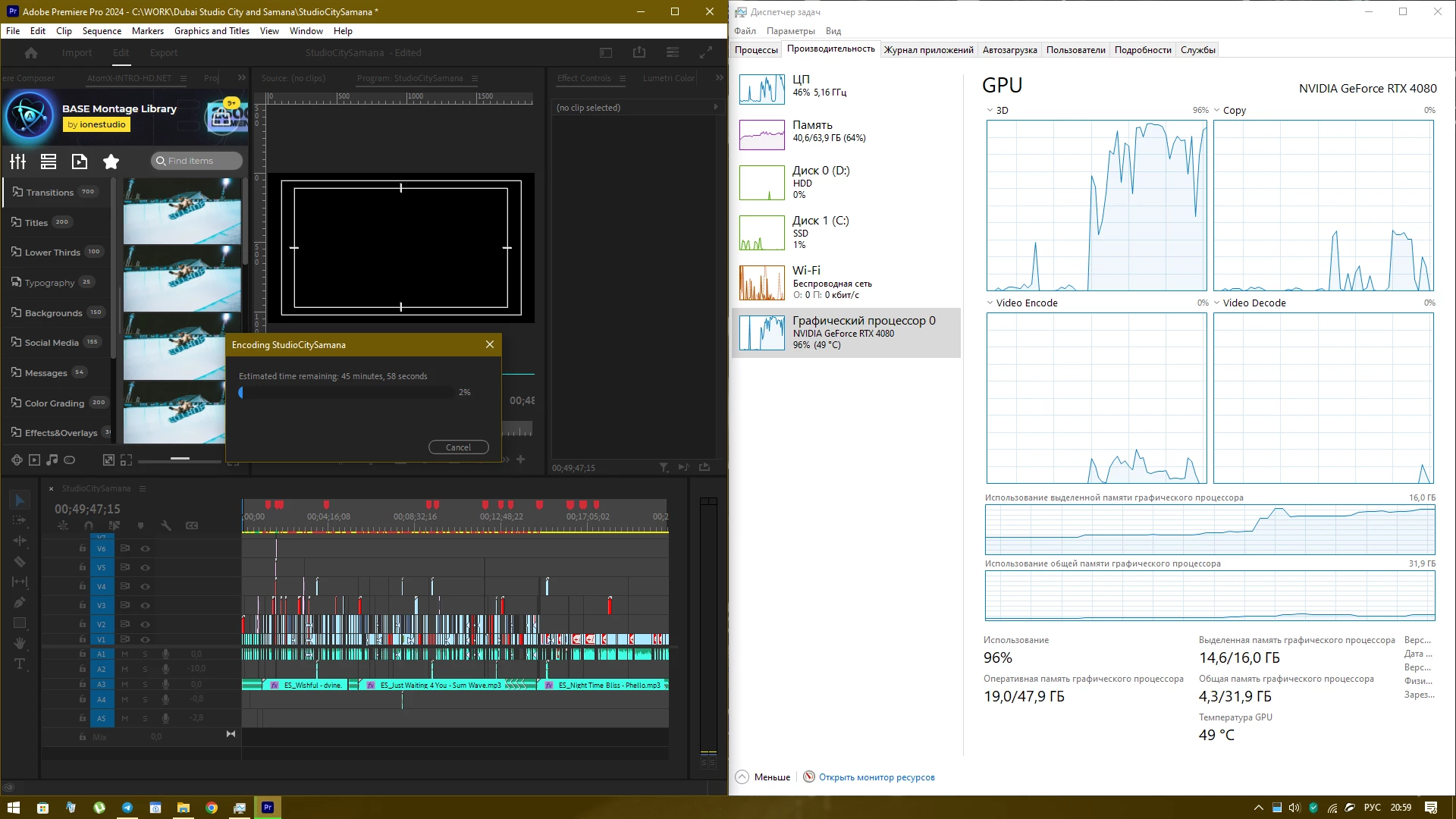 This is my 48 minutes long project and after I started rendering the video, shows there's 10 (TEN!) hours left to finish. What is wrong with this software? The CUDA is activated, I tried making Me window active - the estimated time does not change at all. My CPU is 50% loaded, my graphics card is barely loaded though I'm rendering out into HEVC-h265.