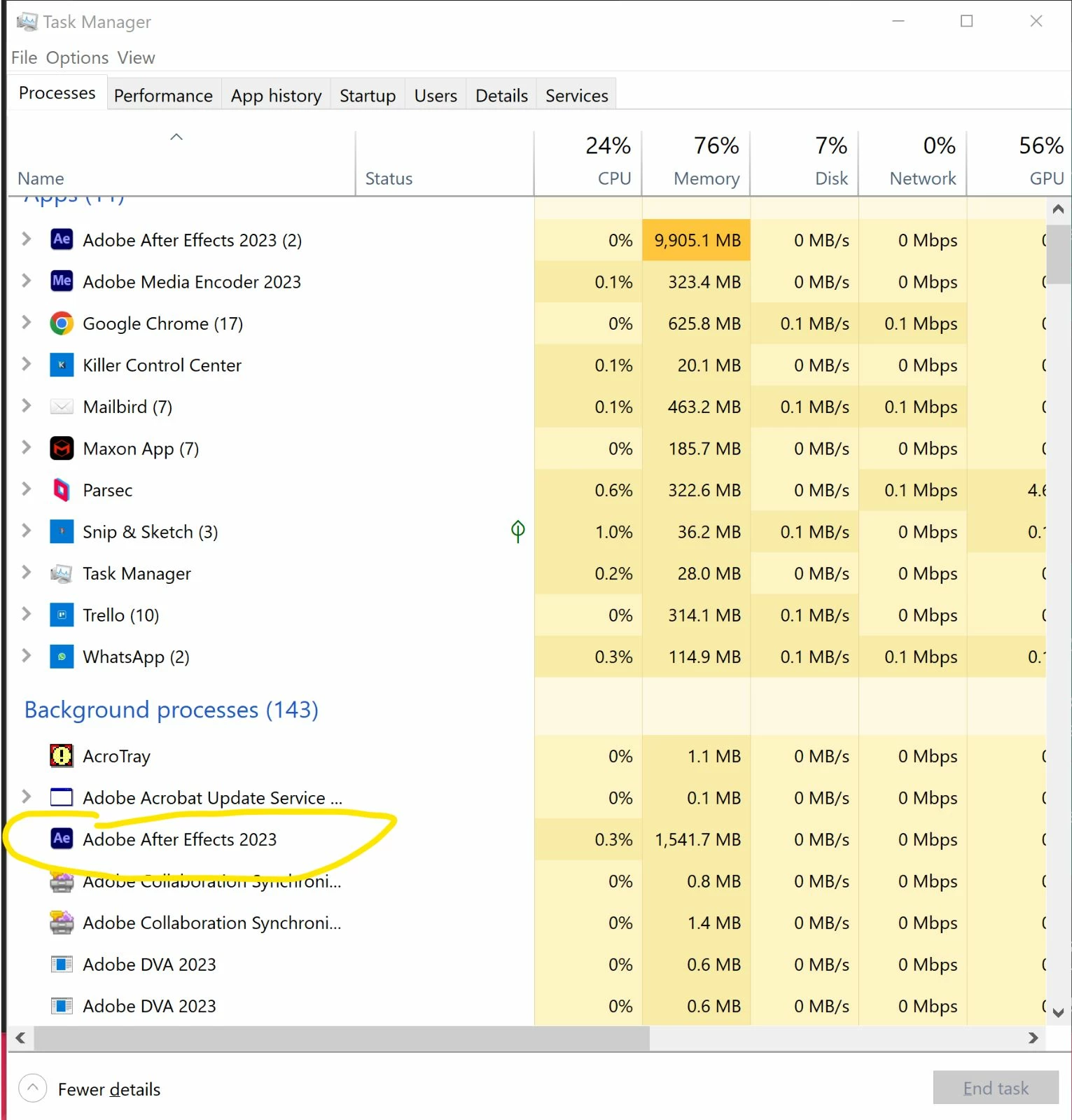 I'm finding Media Encoder 2023 is having an issue where my renders frequently freeze/hang. I'll set up a large queue, let it run, and at some point in the queue it'll just get stuck at a random point in a file and then just hold there for indefinitely. I also have an issue where it'll just sit there forever trying to connect to dynamic link but never start the render. There's a trick folks recommend online, to go into task manager, select After Effects from the background processes and hit "end task." This works to some extent, but not every time and often I'll have to end task multiple times for media encoder to fix itself and continue working.