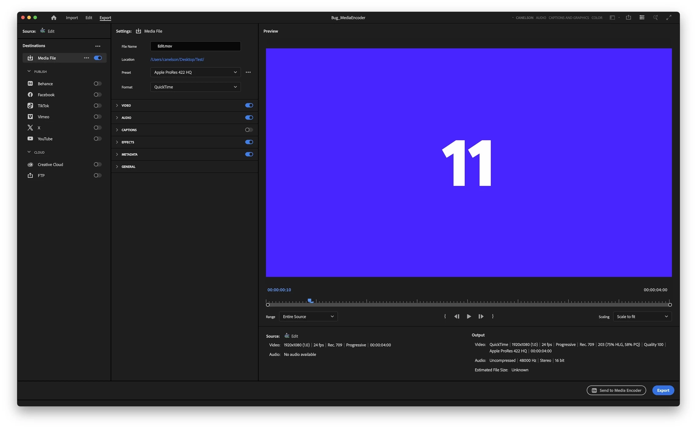 - If I modify any part of the preset settings in Premiere's Export window (for example, I typically disable Effects and Metadata, see image03 below), and send the sequence to AME, the exported video ends up with burned-in captions. Upon inspection, I found that AME has re-enabled the captions setting (see image04 below), even though I had explicitly disabled it in Premiere.