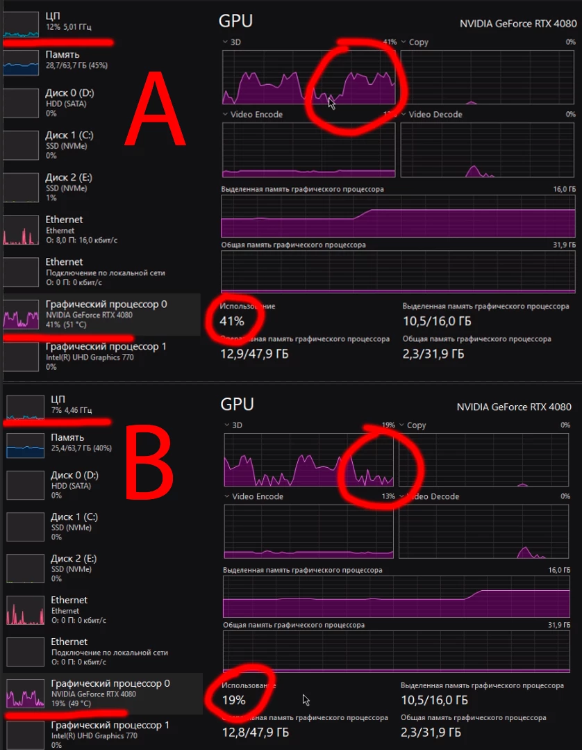 Picture A shows my PC load - both for CPU and GPU - when ME window is active. The program is either maximized or just is not overlapped by any other program window.