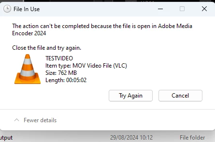 When you go to delete the file, it states that AME is using the file and it cannot be deleted.