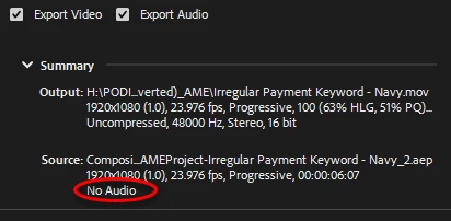 In AE I have an animation I'm exporting, it has a wav file. A normal boring 16bit 44.1KHz audio file. I can play it back just fine in AE, I can hear it, and it will even render out fine with out using the Render Queue. Using the exact same settings to render it in Media Encoder and it refuses to output audio. If I look at source settings it refuses to see that any audio exists. It randomly works, having done NOTHING differently. It can be 2pm and ME will render audio, if it's 4pm and a dog barks, it will stop working. I want to use Media Encoder so I can queue work. I've read 1000000 posts about this, none of them appear to have my issue where the source shows no audio. I've also had a tech get into my computer and wipe out everything, reset the universe and it worked fine for 1 day. Then it rained outside and now it doesn't. It would be nice if I didn't have to get a tech to make this work everytime.