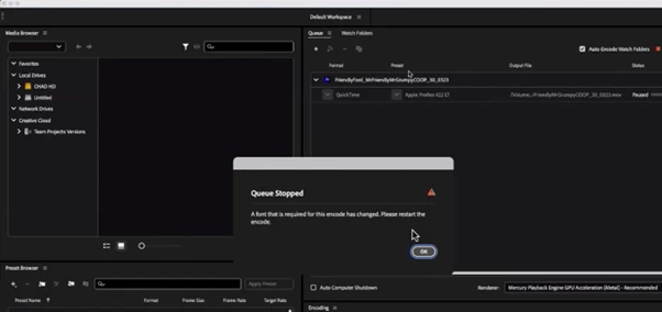When certain projects are exported from Premiere Pro and sent for encoding to Media Encoder an error message is popped up saying “A font that is required for this encode has changed. Please restart the encode”. See the following screenshot.