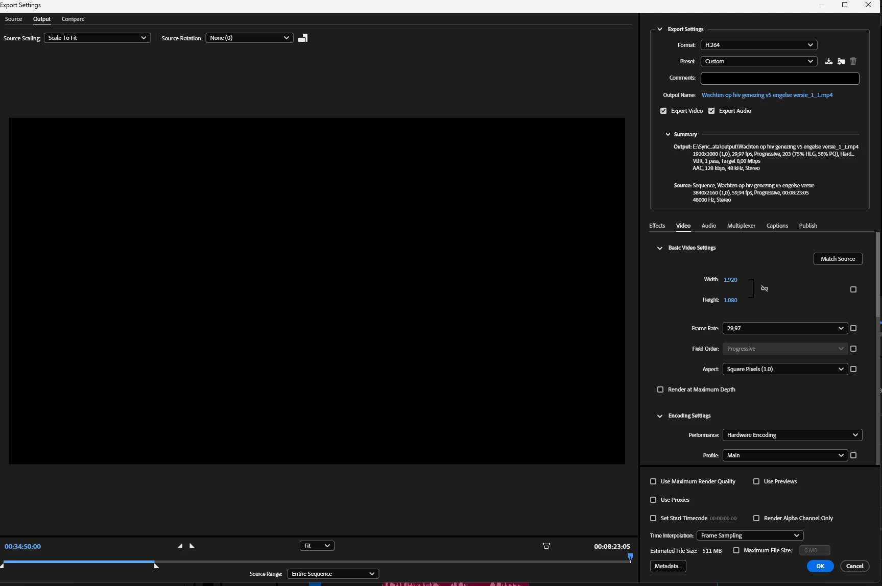 Source range indicator indicates complete timeline is selected for export