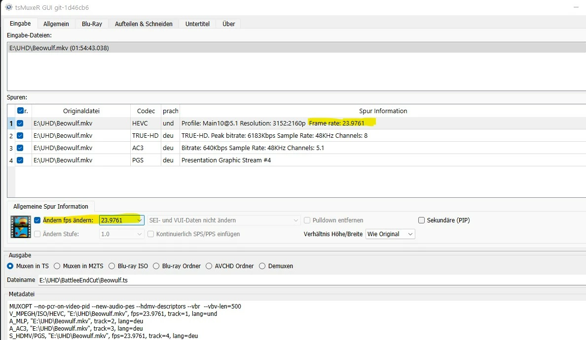 nochmal mit 23,976 in DVDFab durchläuft ist die Datei problemlos verwendbar um damit z.B. eine UHD zu erezugen und zu brennen auf Disc.