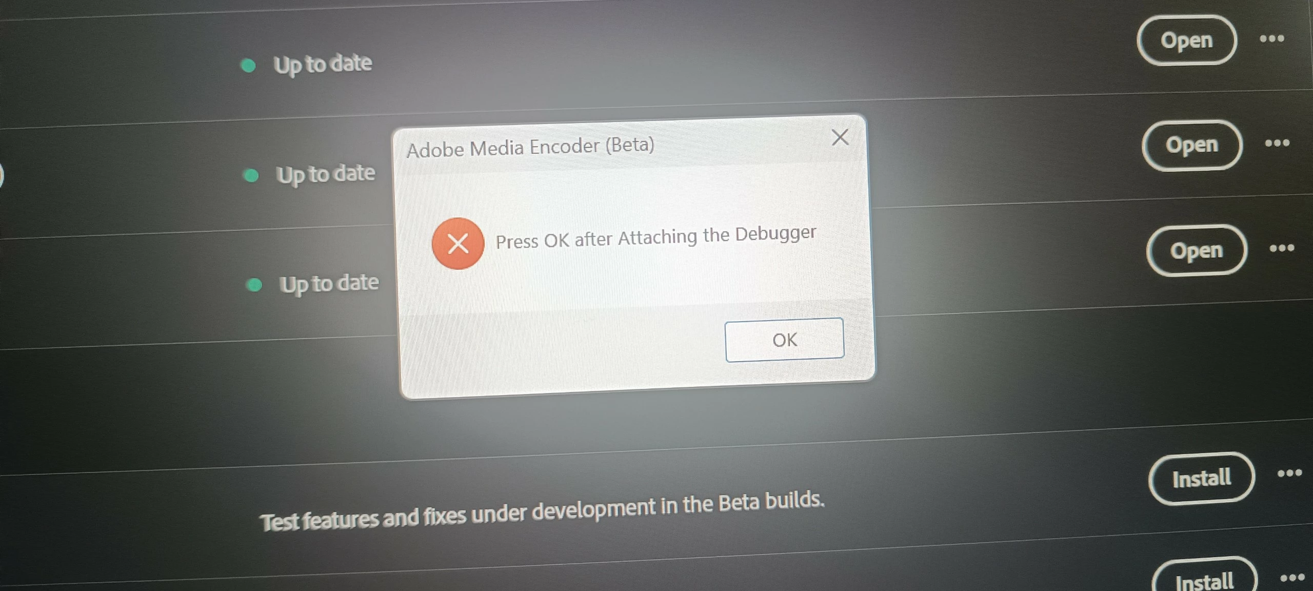 I'm facing an error with the Media Encoder beta. When I opened the application, I immediately encountered the text Press OK after Attaching the Debugger (Image attached below).