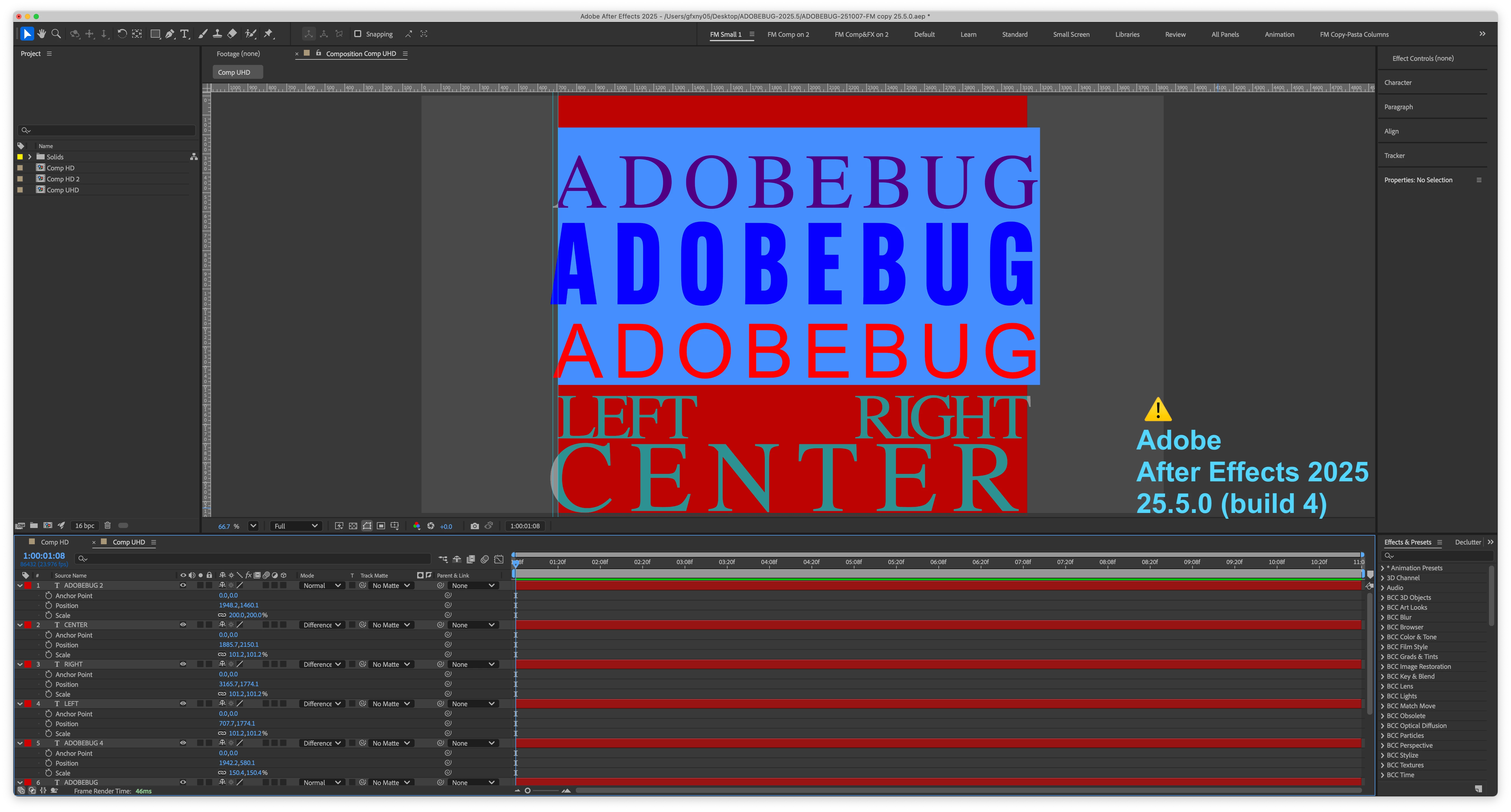 CRITICAL BUG in AE 25.5.0 (on OSX) ; rendering of text - placement error - version inconsistency. MAJOR FLAW!