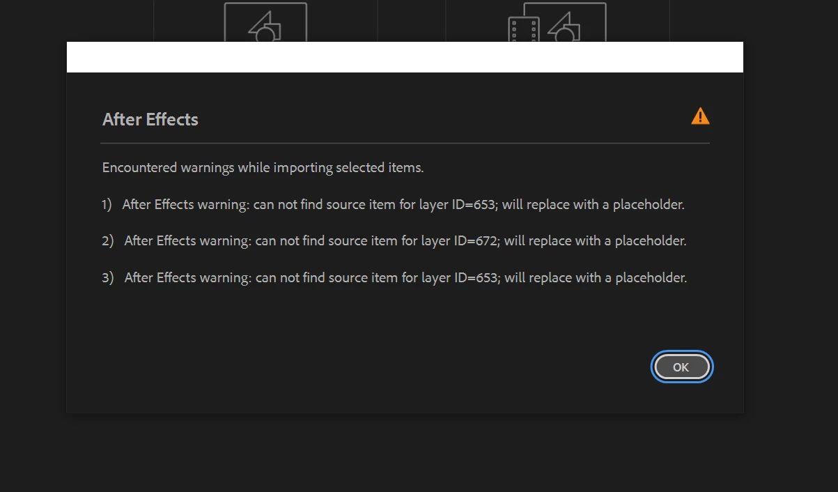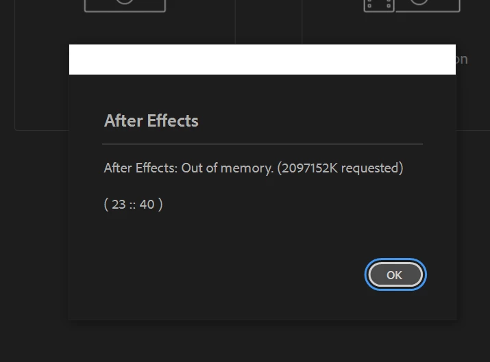 The After Effects project file is damaged, resulting in errors such as "Out of memory (2097152K requested)," missing source items for layers (IDs 653, 672, 653 replaced with placeholders), and file corruption warnings.
